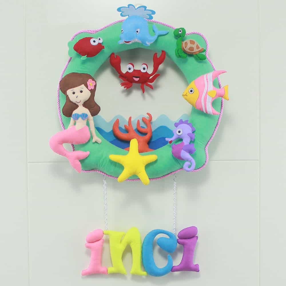 Kapı süsünün ana temasını, ortasında pembe renkli bir deniz kızı figürü bulunan, etrafı yeşil ve mor deniz yosunları ile çevrili yuvarlak bir halka oluşturuyor. Halkanın etrafına, farklı noktalara konumlandırılmış sevimli deniz canlıları figürleri bulunuyor: mavi bir balina, yeşil bir deniz kaplumbağası, kırmızı bir yengeç, sarı ve pembe çizgili bir balık, mor bir denizatı, kırmızı bir balık ve mor bir ahtapot. Halkanın alt kısmında, turuncu bir mercan ve sarı bir denizyıldızı figürü de yer almaktadır. Halkanın altından sarkan iplerle bağlı, pembe, sarı, açık mavi ve mor tonlarında, büyük ve belirgin harflerle yazılmış “İNCİ” ismi yer alıyor. Her bir detay, bebeğinizin odasına hayal gücünü besleyen, pozitif ve huzurlu bir hava katıyor. “İnci” isminin taşıdığı “değerli, nadide, kıymetli” anlamları, bu kapı süsünü minik İnci’nin hayat yolculuğunda değerli, özel ve başarılı bir birey olmasını temenni eden anlamlı bir armağana dönüştürüyor.