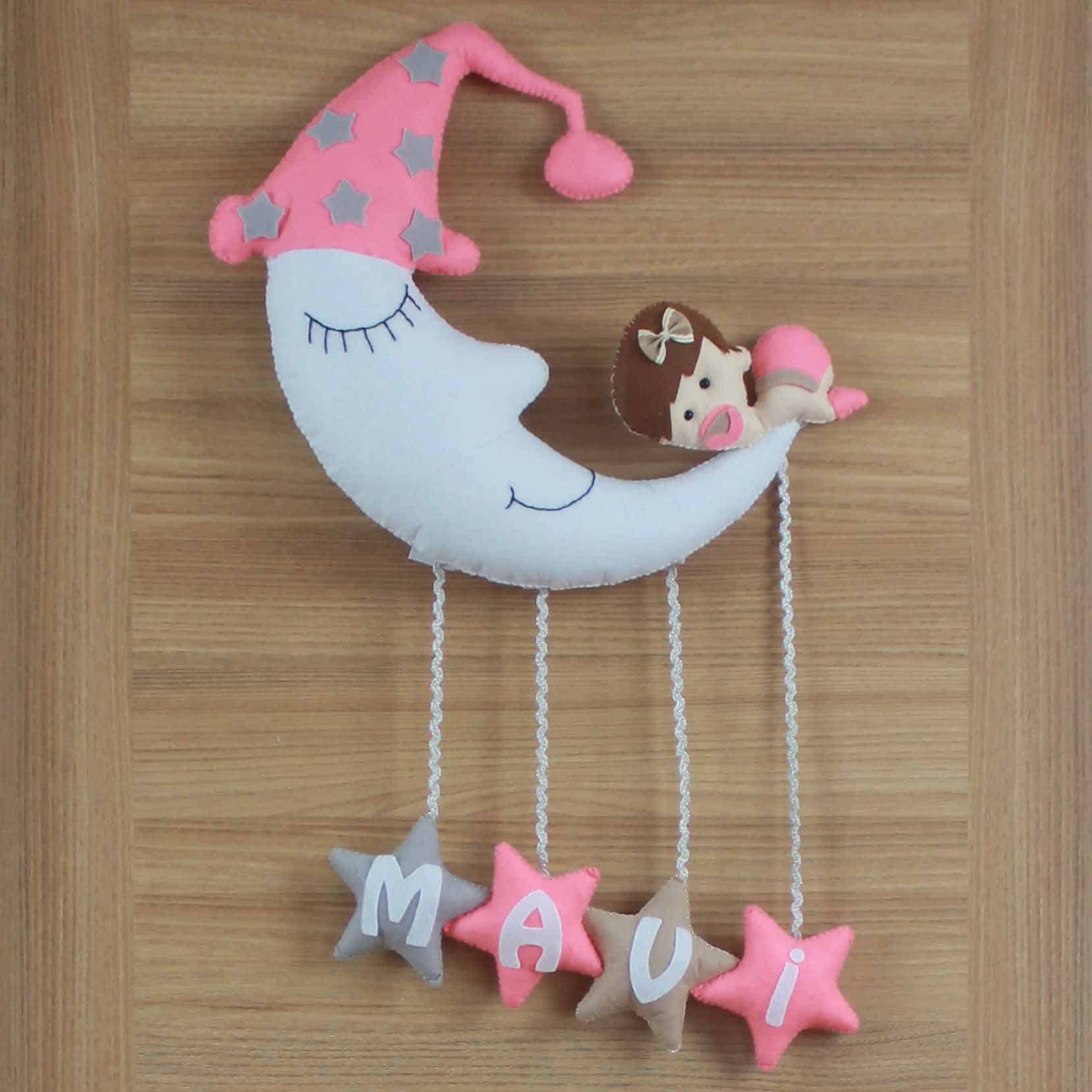 Kapı süsünün üst kısmında, pembe puantiyeli bir uyku şapkası takmış, gözleri kapalı, gülen yüzlü sevimli bir aydede figürü yer alıyor. Aydede’nin üzerinde, pembe kundak içinde uyuyan, kahverengi saçlı şirin bir bebek figürü bulunuyor. Aydede’nin altından sarkan iplerle bağlı, gri ve pembe tonlarda yıldız figürleri üzerinde, büyük ve belirgin harflerle yazılmış “MAVİ” ismi yer alıyor. Her bir detay, bebeğinizin odasına sakin, huzurlu ve düşsel bir hava katıyor. “Mavi” isminin taşıdığı “gökyüzü ve denizin rengi” anlamları, bu kapı süsünü minik Mavi’nin hayat yolculuğunda ferah, derin ve özel bir birey olmasını temenni eden anlamlı bir armağana dönüştürüyor.