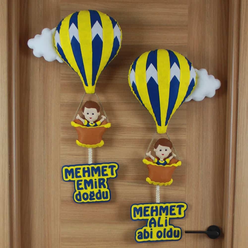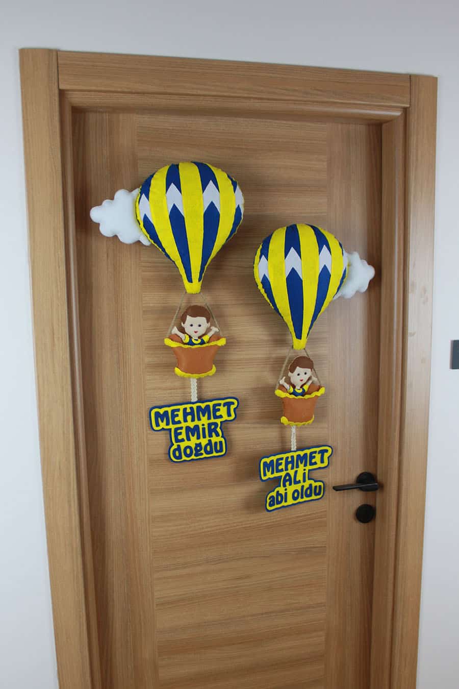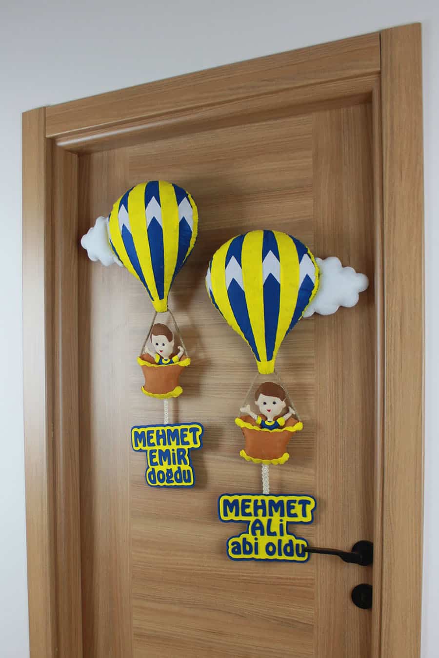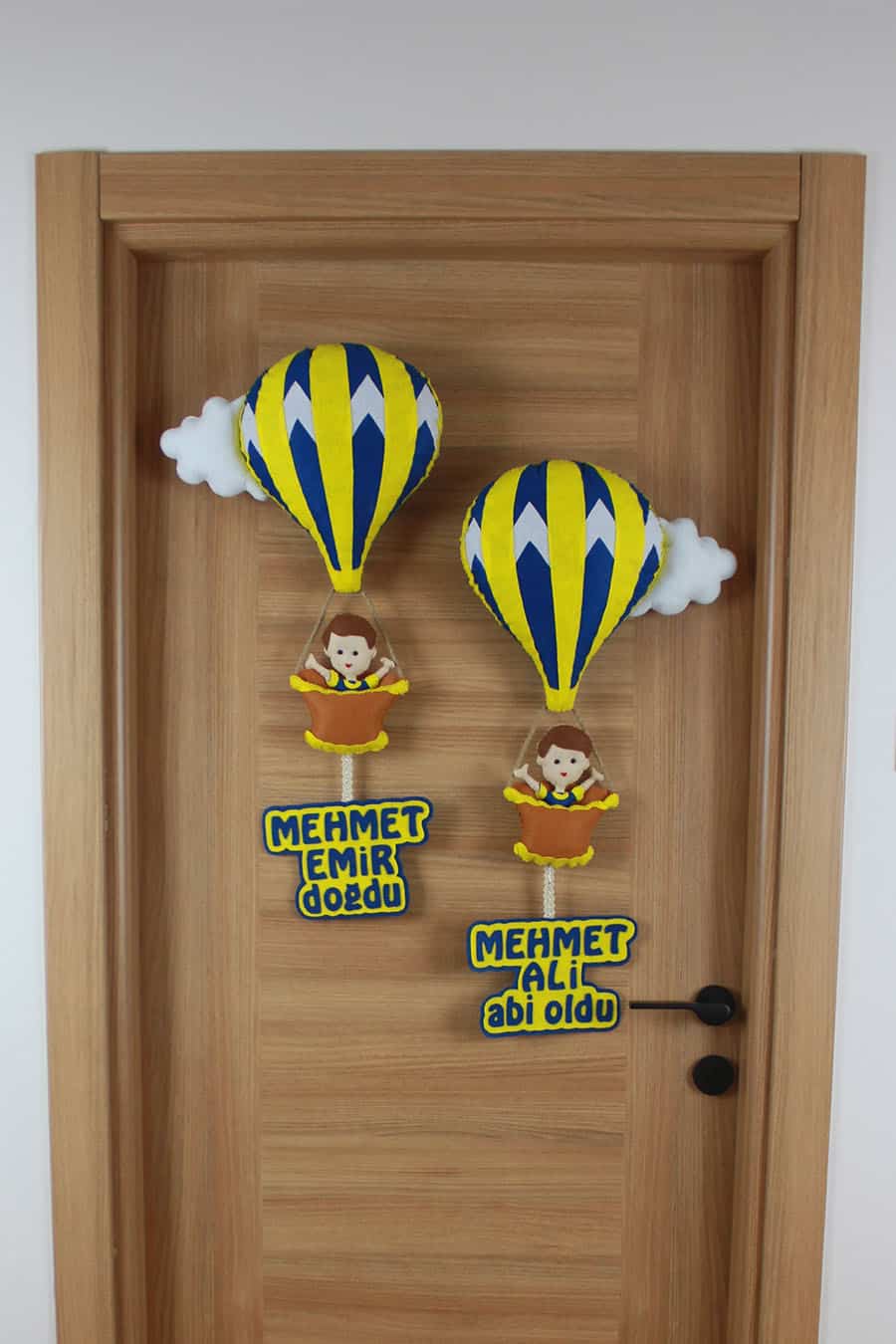 Mehmet Emir ve Mehmet Ali isimli Sarı Lacivert Kardeşler Balonlu Kapı Süsü