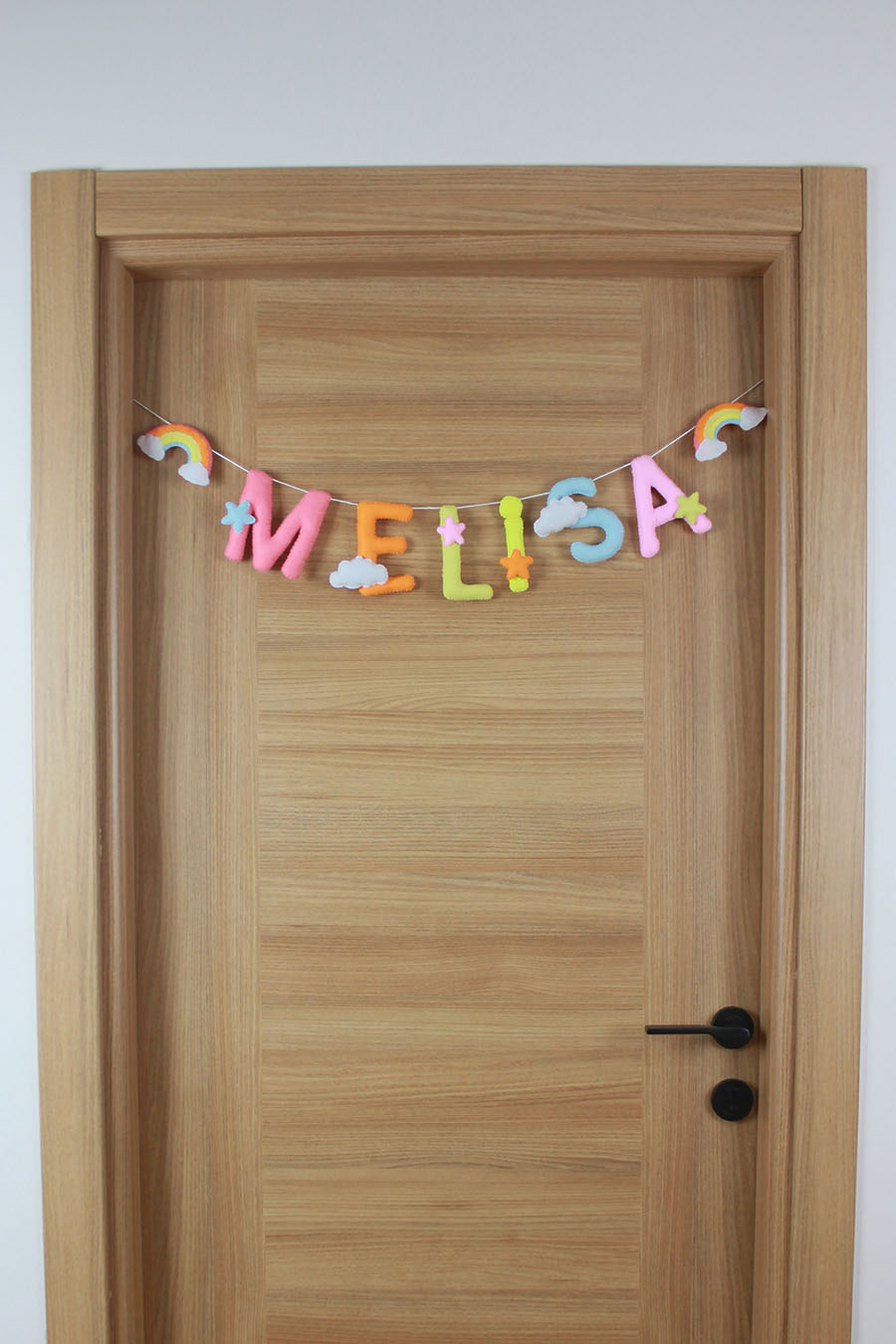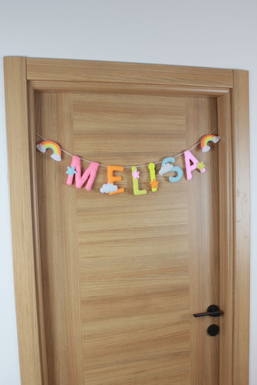Melisa’nın odasına büyülü bir dokunuş! Tamamen el yapımı, kalın ve dolgulu keçeden üretilen bu isimlik, gökkuşağı ve yıldız detaylarıyla “MELİSA” ismini taşıyor. Canlı pembe, sarı ve mavi tonlardaki harfler, aralarındaki bulut ve yıldız süslemeleriyle odanın atmosferini anında masalsı bir havaya sokar. Hastane odası, bebek odası dekorasyonu ve kız çocuk odaları için ideal, şık ve kişiselleştirilmiş bir aksesuardır. Kolayca asılabilir ve uzun yıllar odanın en özel parçası olarak kalır.