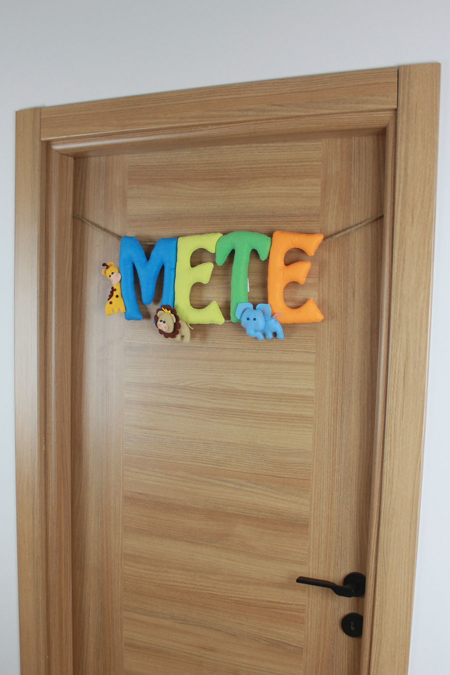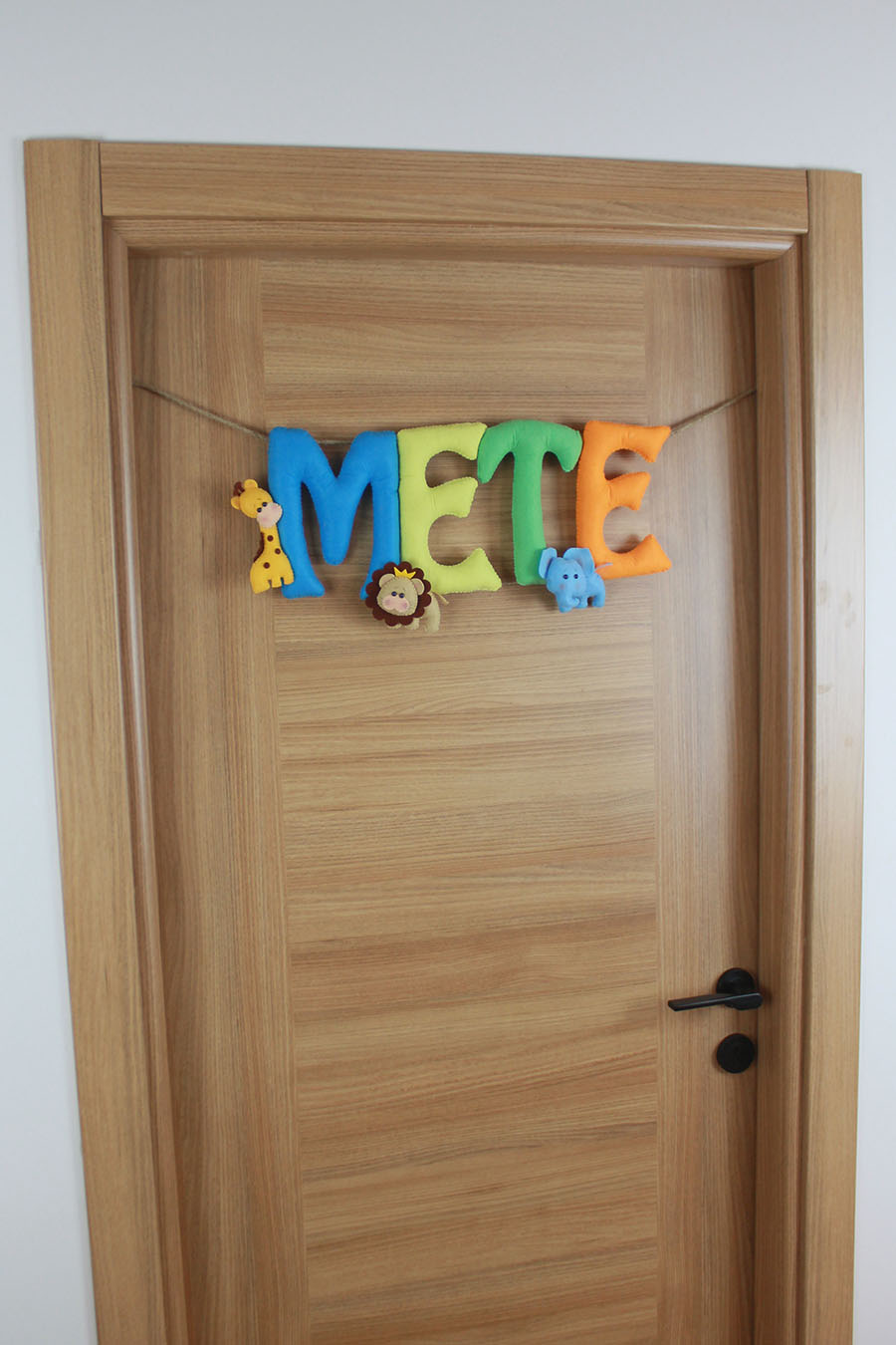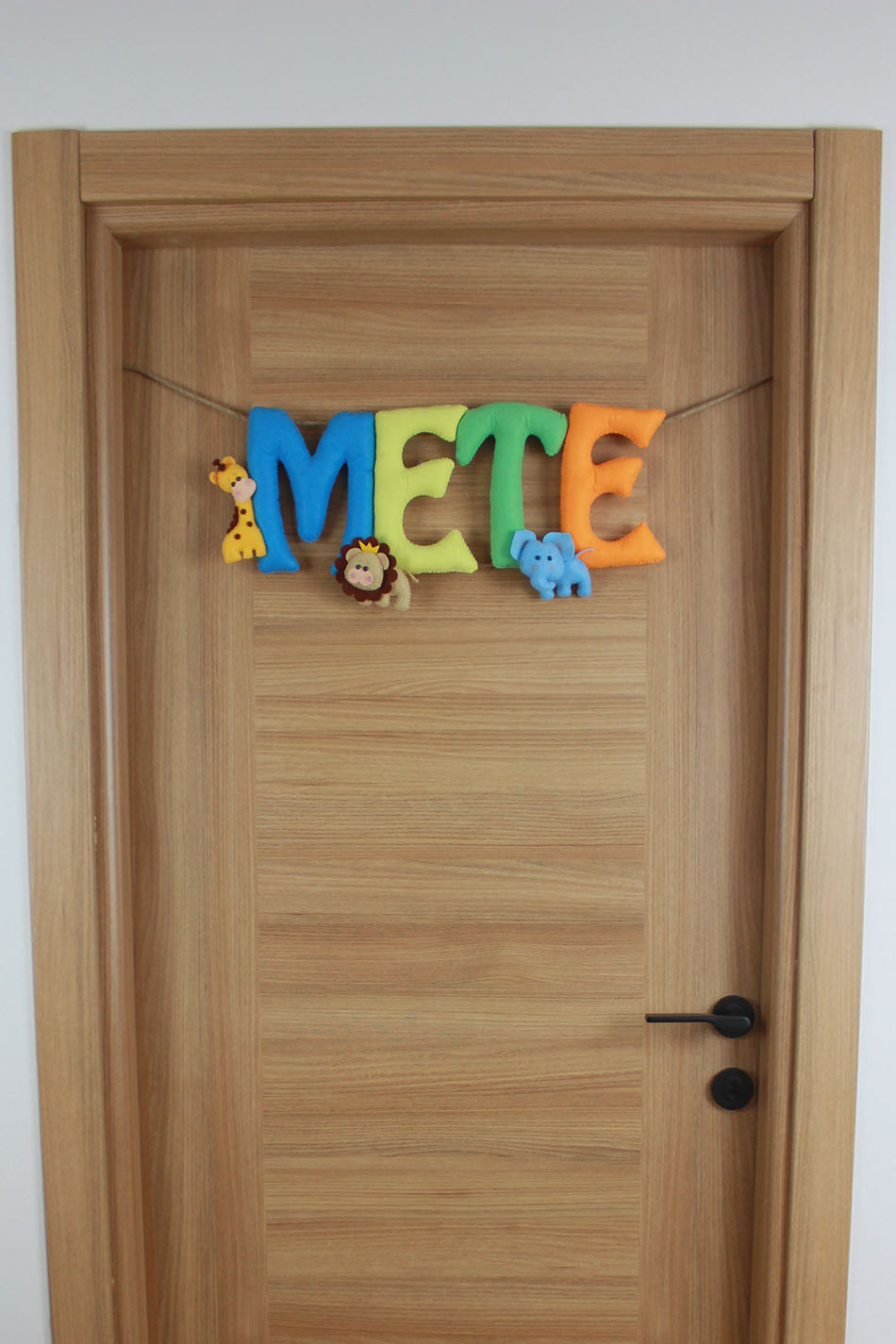 Bebeğinizin gelişini sevimli bir şekilde duyurun! Tamamen el yapımı, yumuşak keçeden üretilmiş bu özel kapı süsü, canlı renklerde “METE” ismini ve yanında zürafa, aslan ve fil gibi sevimli safari hayvanlarını taşıyor. Hastane odası kapısı için mükemmel bir karşılama dekoru olmasının yanı sıra, sonrasında bebek odasının vazgeçilmez bir parçası olacak. Dayanıklı ipi ve hafif yapısıyla kolayca asılır. Kişisel ve unutulmaz bir bebek hediyesi arayanlar için de idealdir.