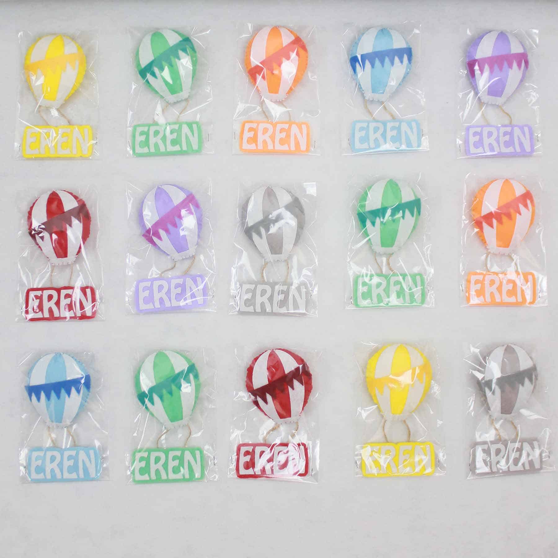 Minik bebeğinizin dünyaya gelişini rengarenk bir coşkuyla kutlayın! Bu sevimli Renkli Balonlar İsimli Magnet, özel günlerinizde misafirlerinize sunabileceğiniz, unutulmaz bir hatıra hediyeliğidir. Görselde yer alan sarı, yeşil, turuncu, mavi, mor, kırmızı ve gri gibi canlı renklerdeki çizgili balon figürleri, bebeğinizin odasına neşe ve hareket katıyor. Her bir balonun altında bebeğinizin isminin (örneğin “EREN”) yazılı olduğu bir detay bulunmaktadır, bu da magnetleri tamamen kişiye özel hale getirir.