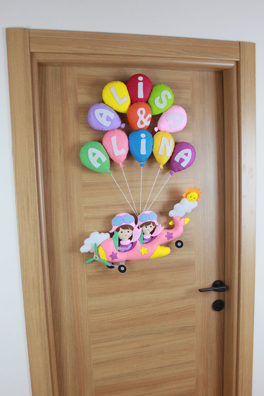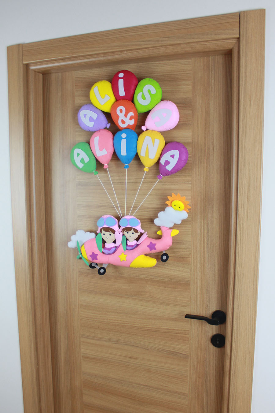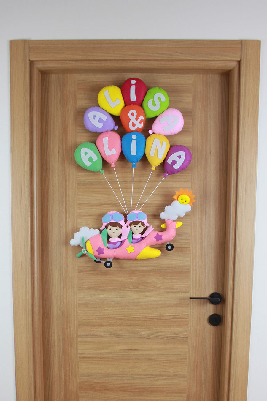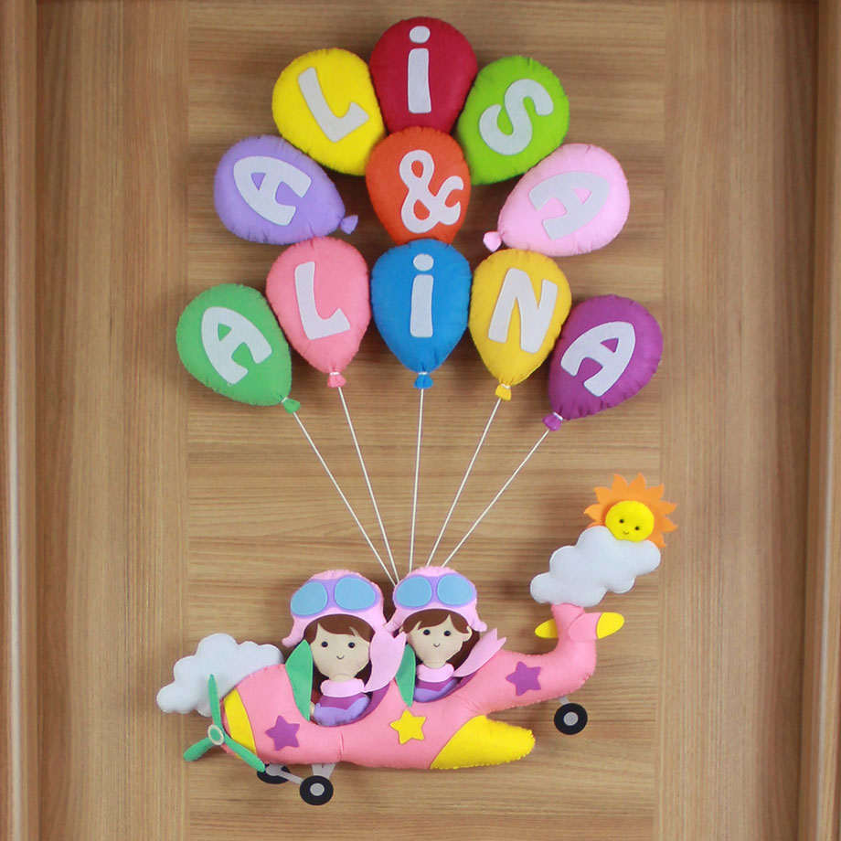 İki kız kardeşin odasına neşe katacak, tamamen el emeği ile hazırlanan Alisa ve Alina isimli pilot temalı kapı süsü! Renkli uçan balonlarla taşınan pembe uçağın içinde iki sevimli pilot figürü, bulutlar ve güneş detaylarıyla bezeli bu tasarım, keçe malzemeden titizlikle üretilmiştir. Kişiye özel isimlerle hazırlanan bu ürün, hem hastane odası süslemesi hem de bebek/çocuk odası dekorasyonu için mükemmel bir seçimdir.