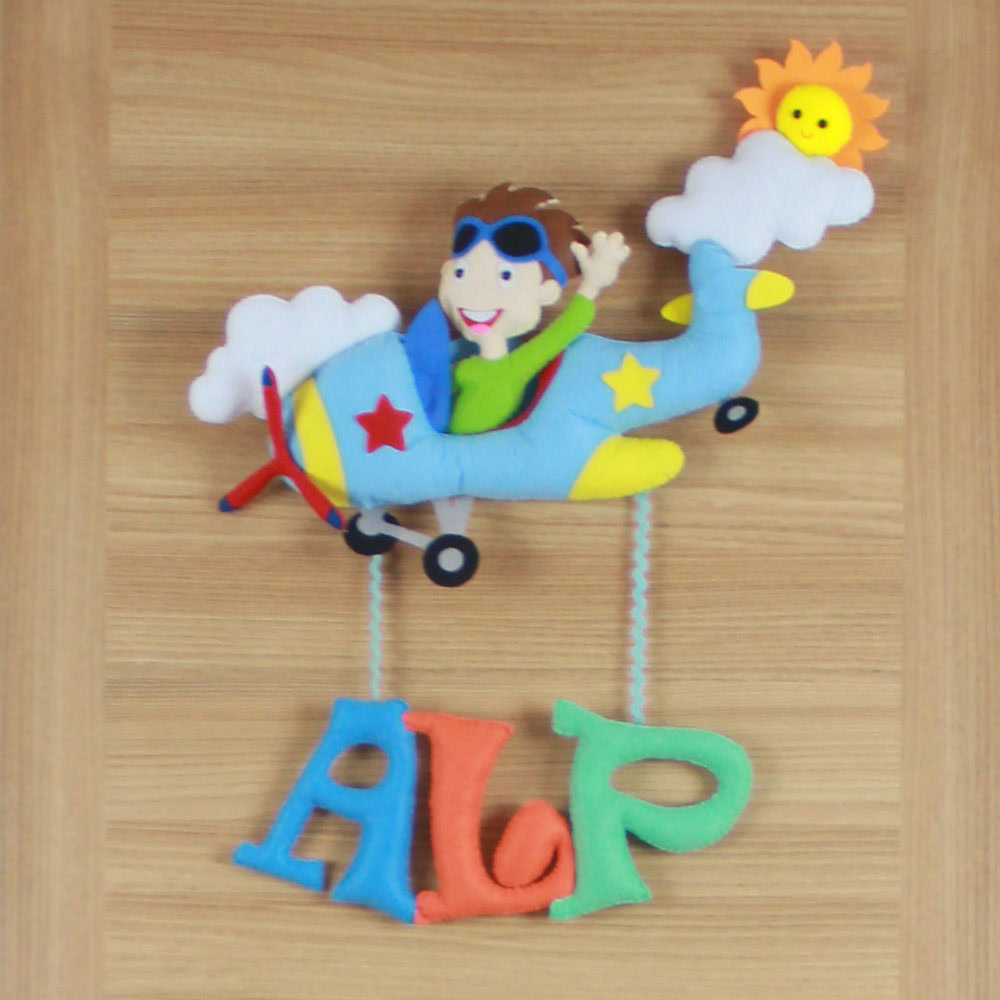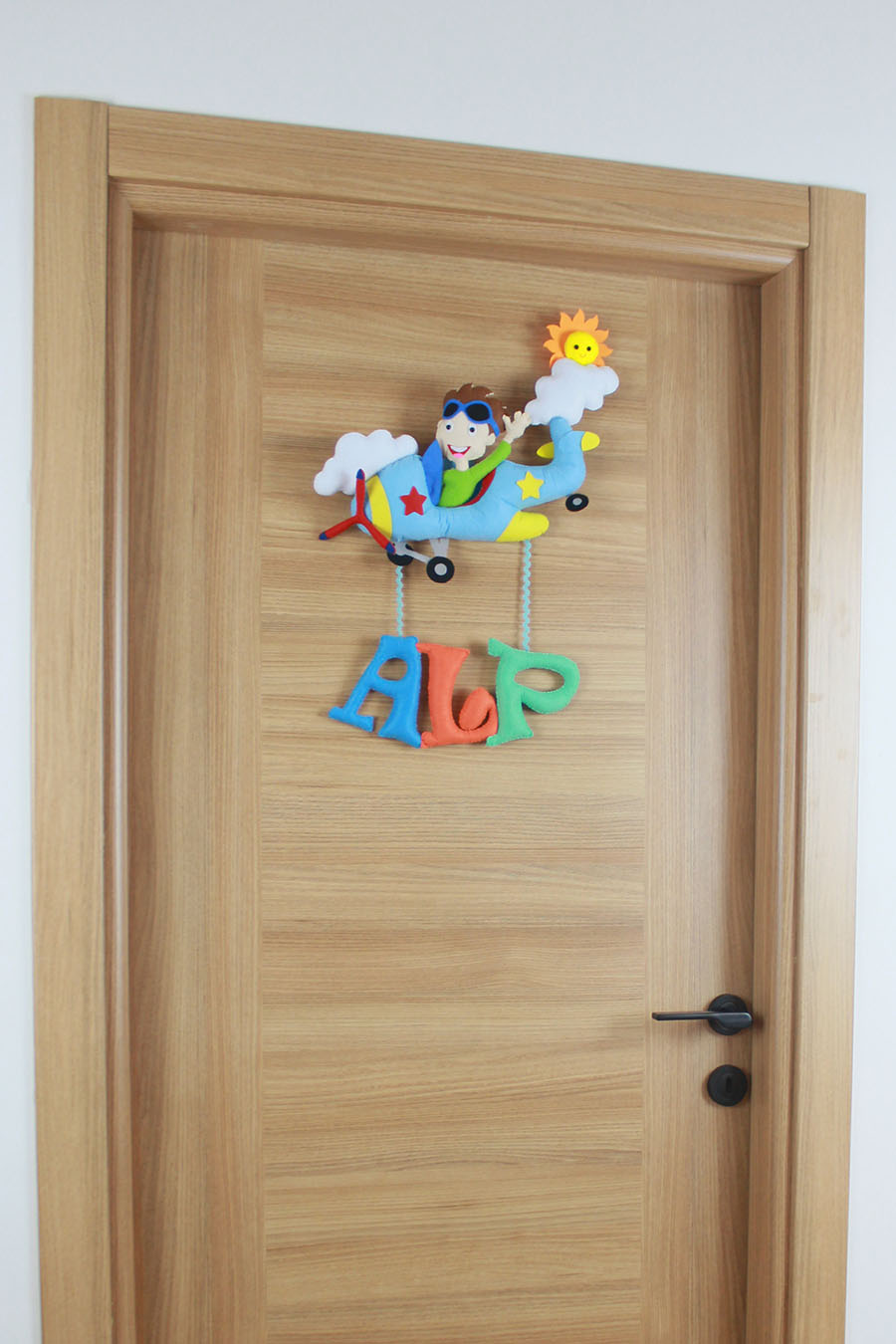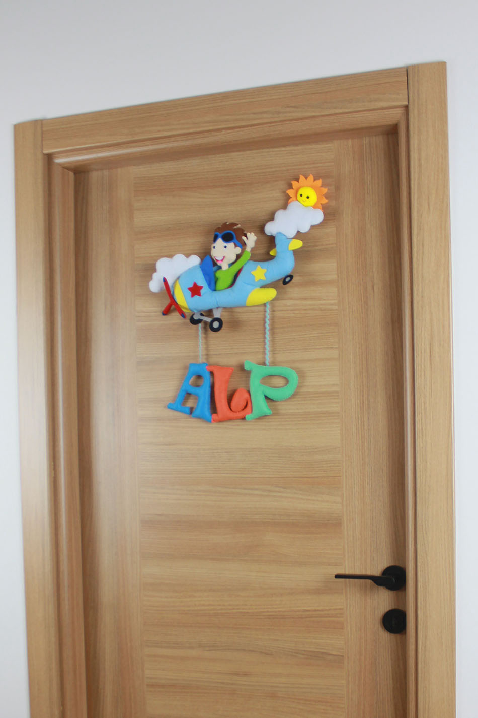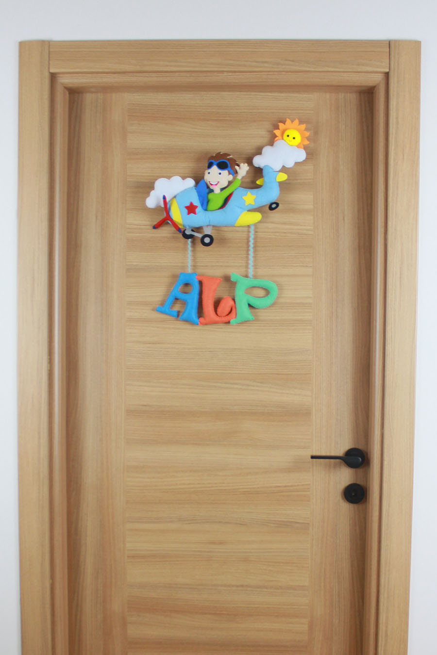 Gökyüzü maceralarını seven minikler için tasarlandı! Tamamen el yapımı olan bu keçe kapı süsü, mavi uçağında el sallayan sevimli bir pilot, gülen güneş ve pofuduk bulut detaylarıyla süslenmiştir. Ürünün alt kısmında, canlı renklerde (Mavi, Turuncu, Yeşil) hazırlanan dolgulu harflerle “ALP” ismi sallanmaktadır. Hastane kapı süsü olarak yenidoğan karşılamalarında veya bebek odası dekorasyonunda duvar süsü olarak kullanılabilir. Yumuşak dokusu ve neşeli renkleriyle odanıza sıcaklık katar.