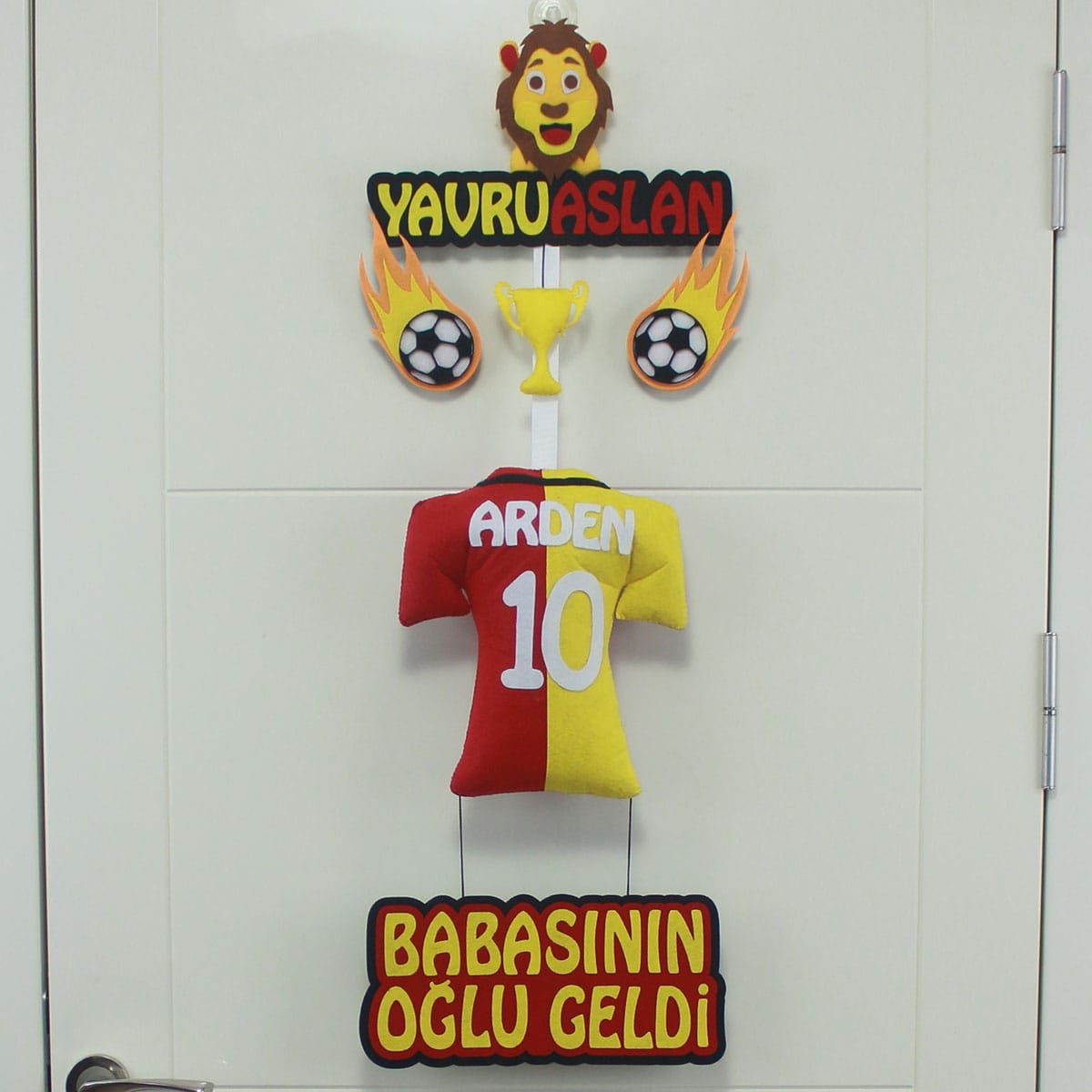 Bu kişiye özel kapı süsü, sarı kırmızı renklere gönül vermiş ailelerin kalpten bağlılığını modern ve estetik bir dille ifade eden, futbol coşkusuyla bezeli anlamlı bir armağandır. Doğum hastane odasında misafirlerinizi etkileyecek ilk izlenimi bırakırken, sonrasında bebeğinizin odasında asil bir erkek bebek dekoru olarak ömür boyu yerini alacak. Her bir detayı büyük bir özenle, el emeğiyle hazırlanan bu eser, biricik Arden’iniz için sadece ona özel bir kutlama sunar. Bu göz alıcı yavru aslan kapı süsü, sevdikleriniz için unutulmaz bir bebek hediyesi seçeneği olup, aynı zamanda eşsiz bir Arden kapı süsü olarak da öne çıkar. Bebek kapı süsleri arasında fark yaratacak, hem anlamlı hem de şık bir tercih olan bu ürün, yenidoğan süsleme ve **hastane odası süsü** ihtiyacını karşılayan ideal bir seçimdir.