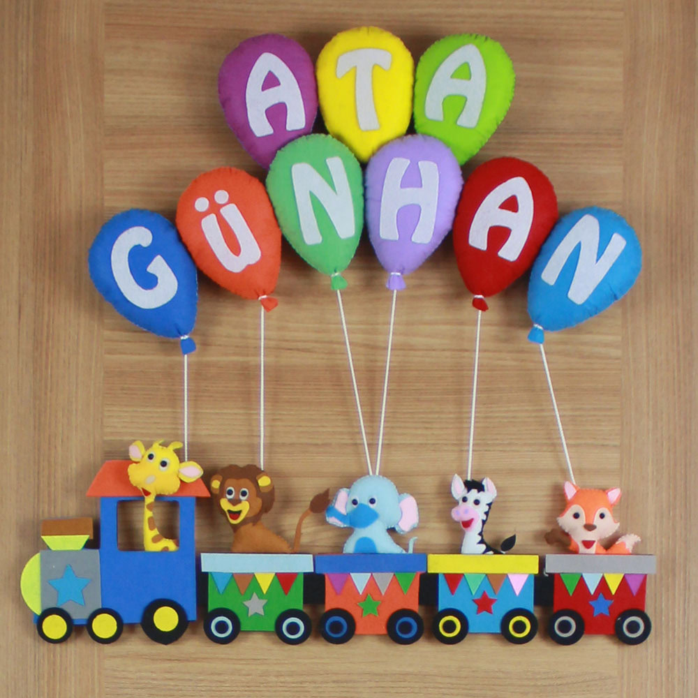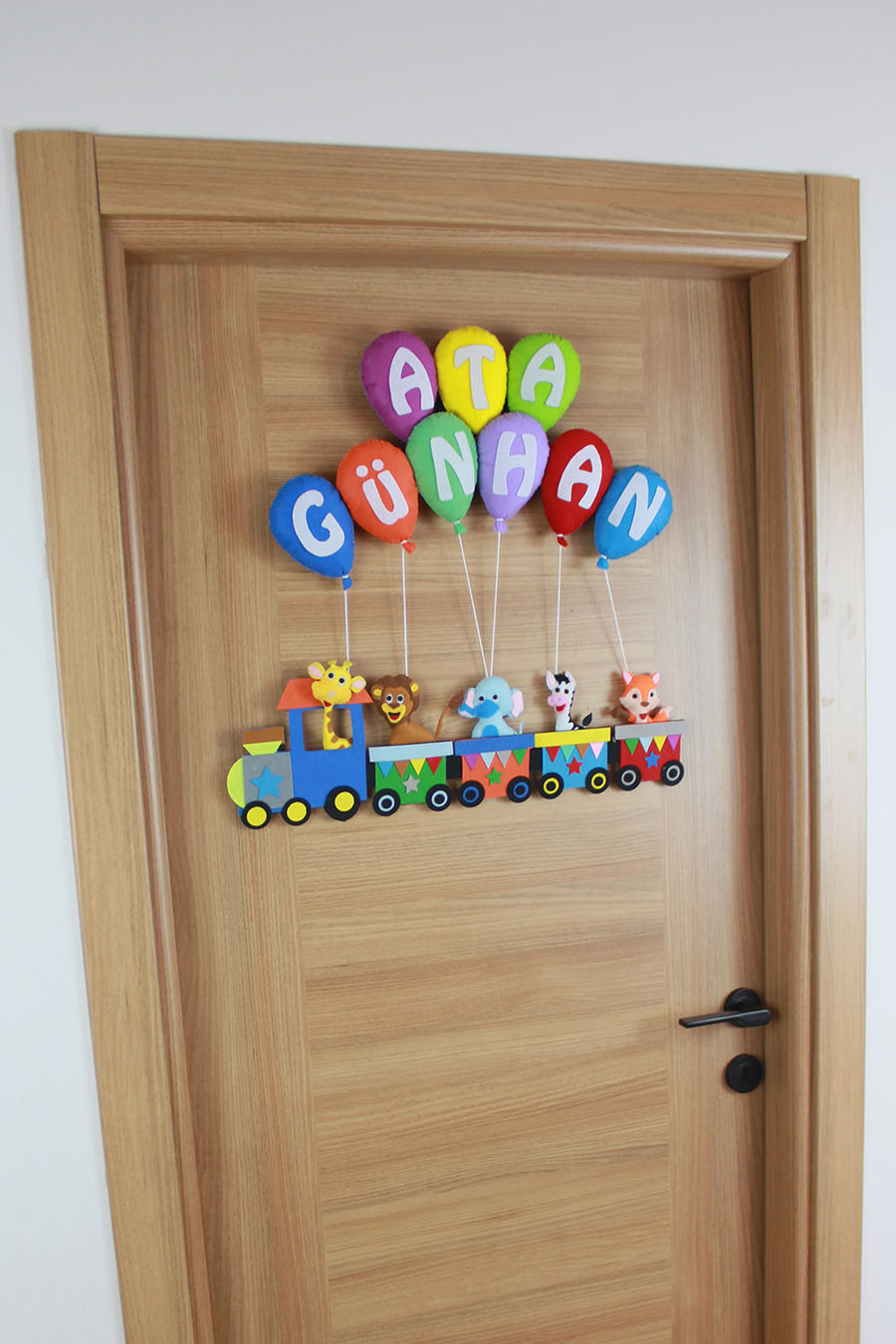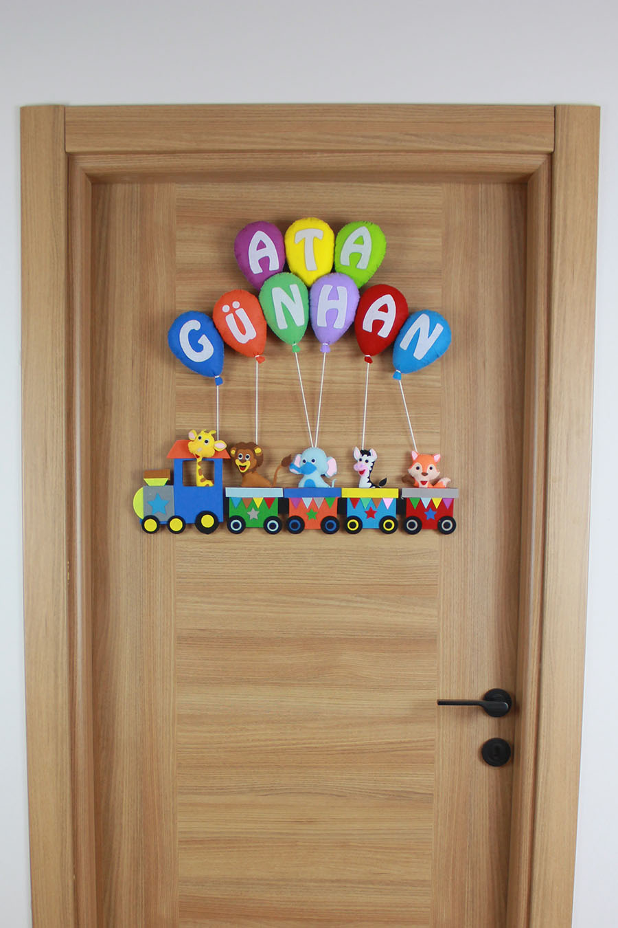Ata Günhan bebeğin odasına neşe taşıyan bu özel tasarım, renkli bir safari treni konseptiyle hazırlanmıştır. Lokomotif ve vagonlarda seyahat eden zürafa, aslan, fil, zebra ve tilki figürleri tamamen el yapımı keçe işçiliğidir. İsim bölümü, rengarenk uçan balonlar üzerine işlenerek üç boyutlu bir form kazandırılmıştır. Hem hastane kapısı süslemesi hem de çocuk odası dekoru için canlı ve eğlenceli bir seçenektir.