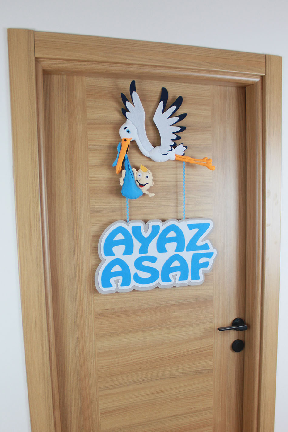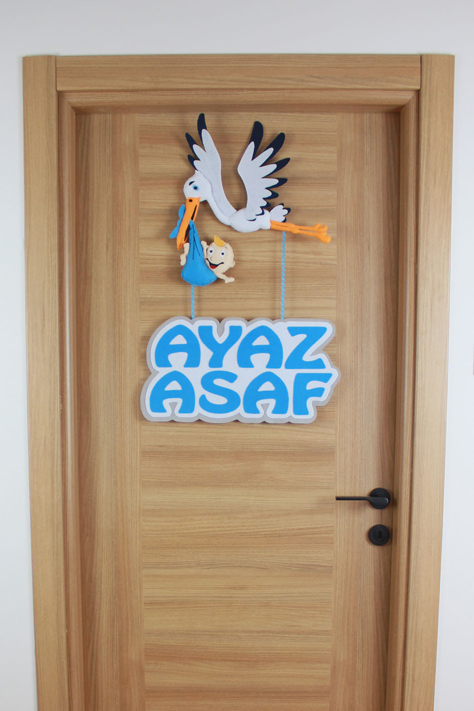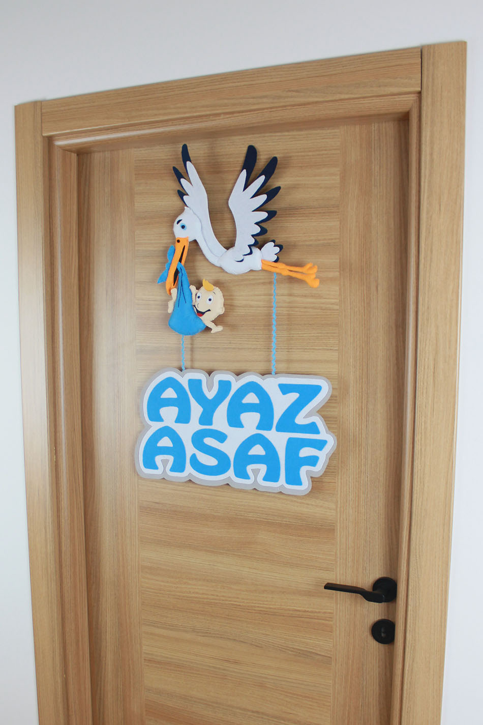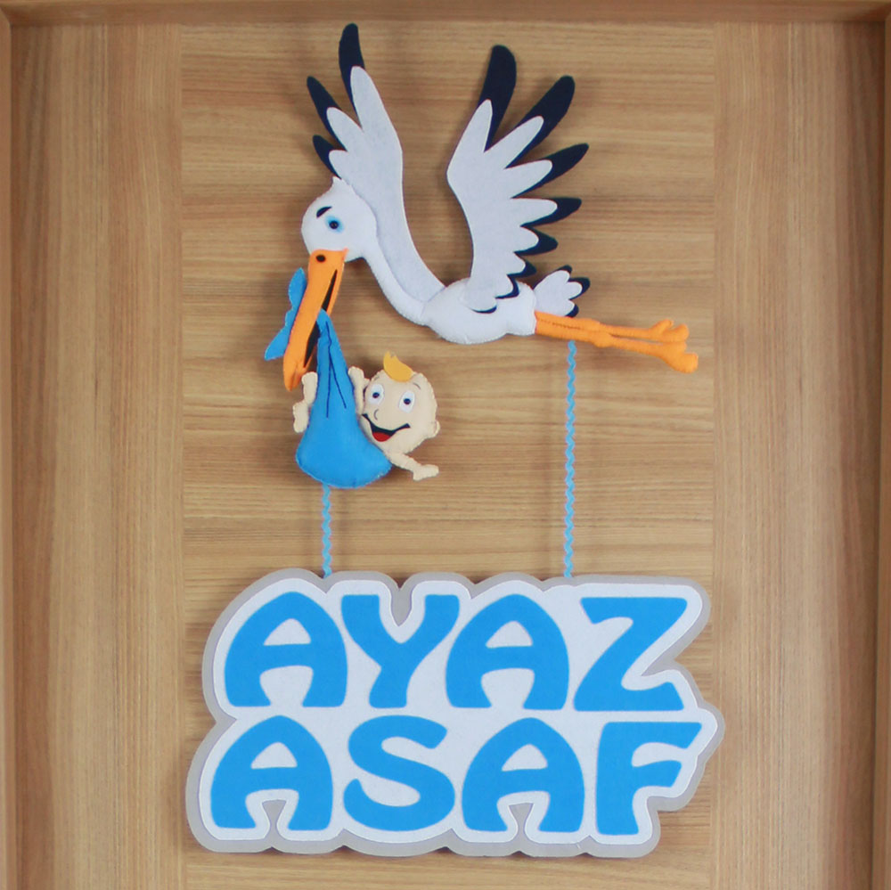 Geleneksel müjdeci leylek figürü, Ayaz Asaf bebek için modern bir tasarımla buluşuyor! El yapımı keçe malzemeden üretilen bu özel kapı süsü, gagasında mavi çıkın içerisinde bebek taşıyan sevimli bir leylek figürü ve altında sallanan büyük puntolu isimlikten oluşmaktadır. Kalın keçe dokusu ve canlı mavi-beyaz renkleriyle hem hastane odası girişinde hem de bebek odasında fark yaratır. Uzun yıllar saklanabilecek kalitede, tamamen el işçiliği bir dekorasyon ürünüdür.