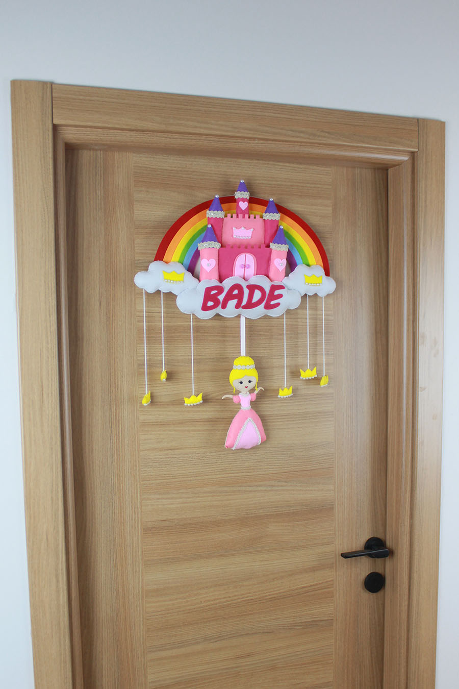 Küçük prensesiniz “BADE” için masalsı bir karşılama! Tamamen el yapımı, yumuşak keçe malzemeden üretilmiş bu özel kapı süsü, pembe bir şato, gökkuşağı ve bulutlar üzerindeki kişiselleştirilmiş “BADE” ismi ile adeta rüyaları süslüyor. Altından sallanan taç figürleri ve prenses bebek figürü ile odanın atmosferini anında bir şatoya dönüştürür. Hastane odası, bebek odası ve doğum günü dekorasyonu için mükemmeldir. Kaliteli işçiliği sayesinde uzun yıllar hatıra olarak saklanabilir.