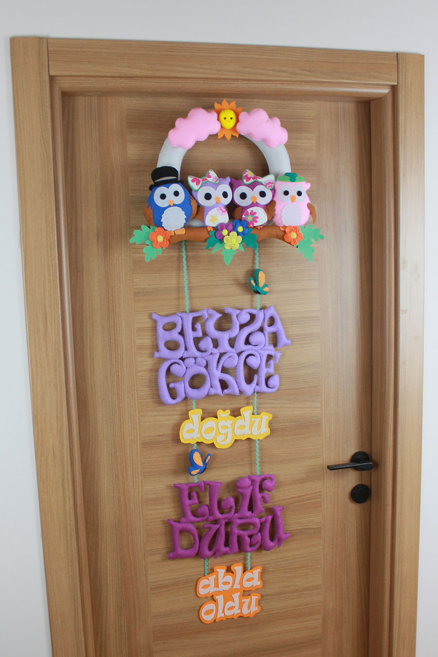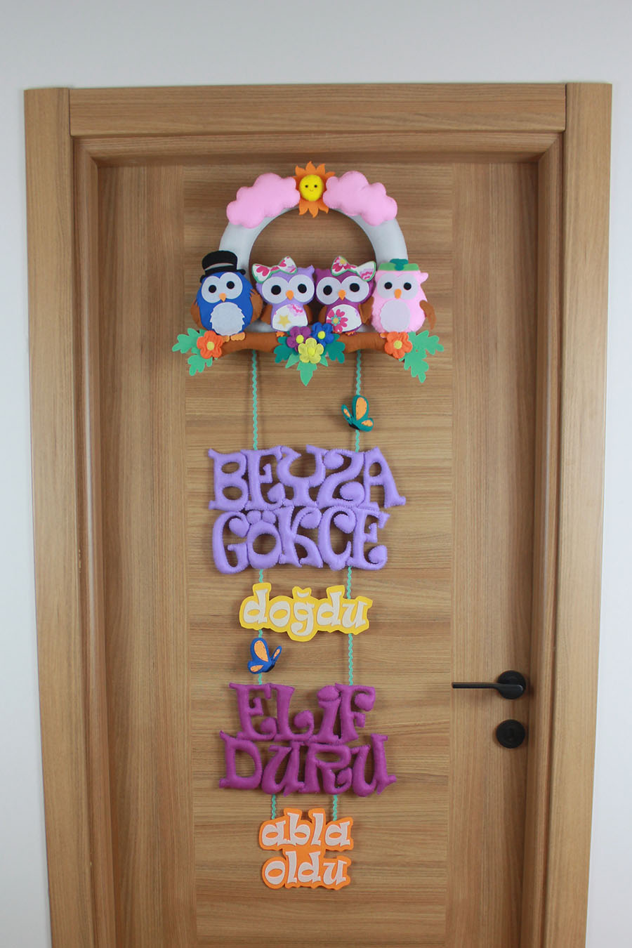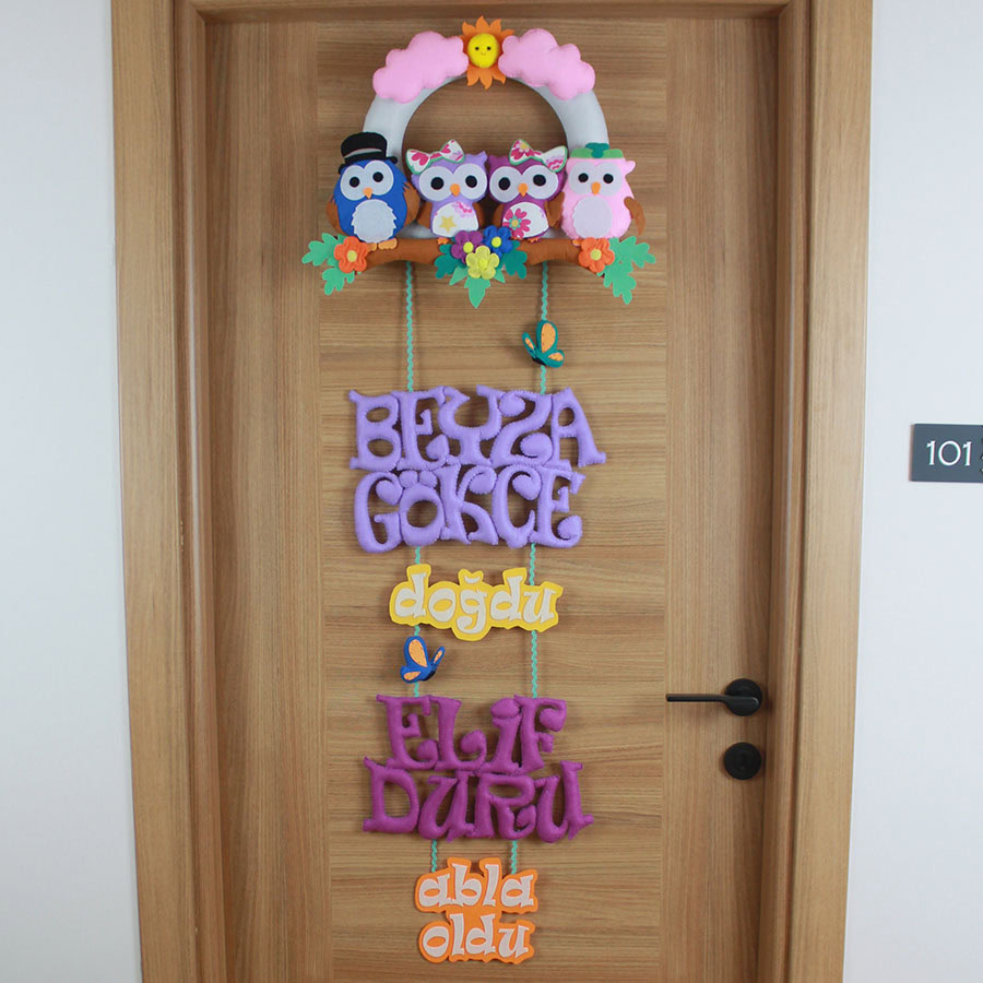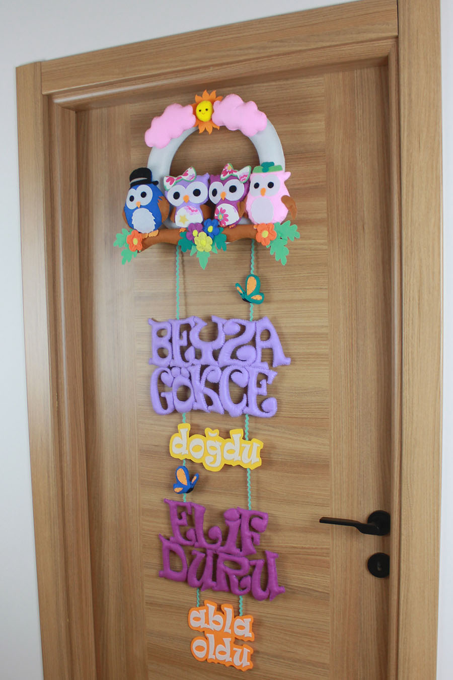 Kardeşlik bağını kutlayan eşsiz bir dekorasyon! Tamamen el yapımı, yumuşak keçeden üretilmiş bu kapı süsü, Beyza Gökçe’nin doğumu ve Elif Duru’nun “abla oluşu”nu sevimli baykuş figürleriyle taçlandırıyor. Üzerinde 4 farklı baykuşun yer aldığı dal, “BEYZA GÖKÇE doğdu” ve “ELİF DURU abla oldu” yazılarıyla kişiselleştirilmiştir. Hastane odası, bebek odası ve kardeş temalı partiler için mükemmel bir hediyelik ve hatıradır. Canlı renkler ve detaylı çiçek figürleriyle odanın atmosferine neşe katar.