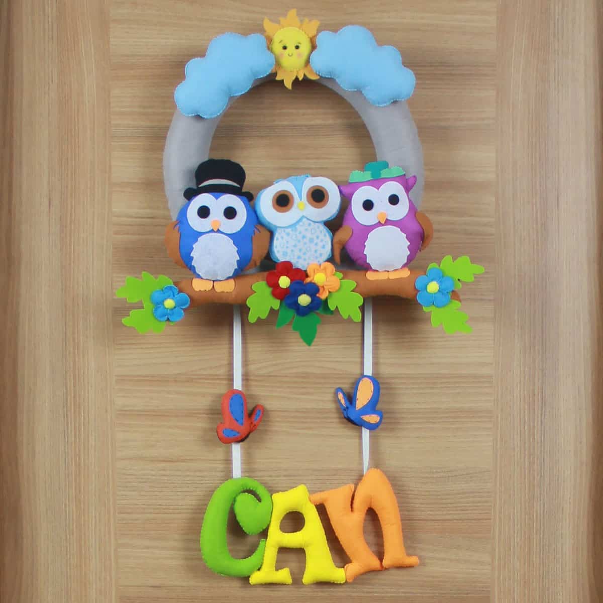 Kapı süsünün ana temasını, üst kısımda yer alan, ortasında gülen yüzlü bir güneş ve iki yanında mavi bulutlar bulunan gri renkli bir halka oluşturuyor. Halkanın alt kısmında, çiçeklerle süslenmiş kahverengi bir dal figürü bulunmaktadır. Dalın üzerinde, şapkalı mavi bir baykuş, çiçekli mor bir baykuş ve ortalarında küçük mavi bir baykuş olmak üzere üç adet sevimli baykuş figürü yer alıyor. Dalın altından sarkan iplerle bağlı, iki adet rengarenk kelebek figürü tasarıma eşlik ediyor. Kelebeklerin altından sarkan iplerle bağlı, yeşil, sarı ve turuncu tonlarda, büyük ve belirgin harflerle yazılmış “CAN” ismi yer alıyor. Her bir detay, bebeğinizin odasına hayal gücünü besleyen, pozitif ve enerji dolu bir hava katıyor. “Can” isminin taşıdığı “yaşam, ruh; sevgili, aziz” anlamı, bu kapı süsünü minik Can’ın hayat yolculuğunda aydınlık, neşeli ve başarılı bir birey olmasını temenni eden anlamlı bir armağana dönüştürüyor.