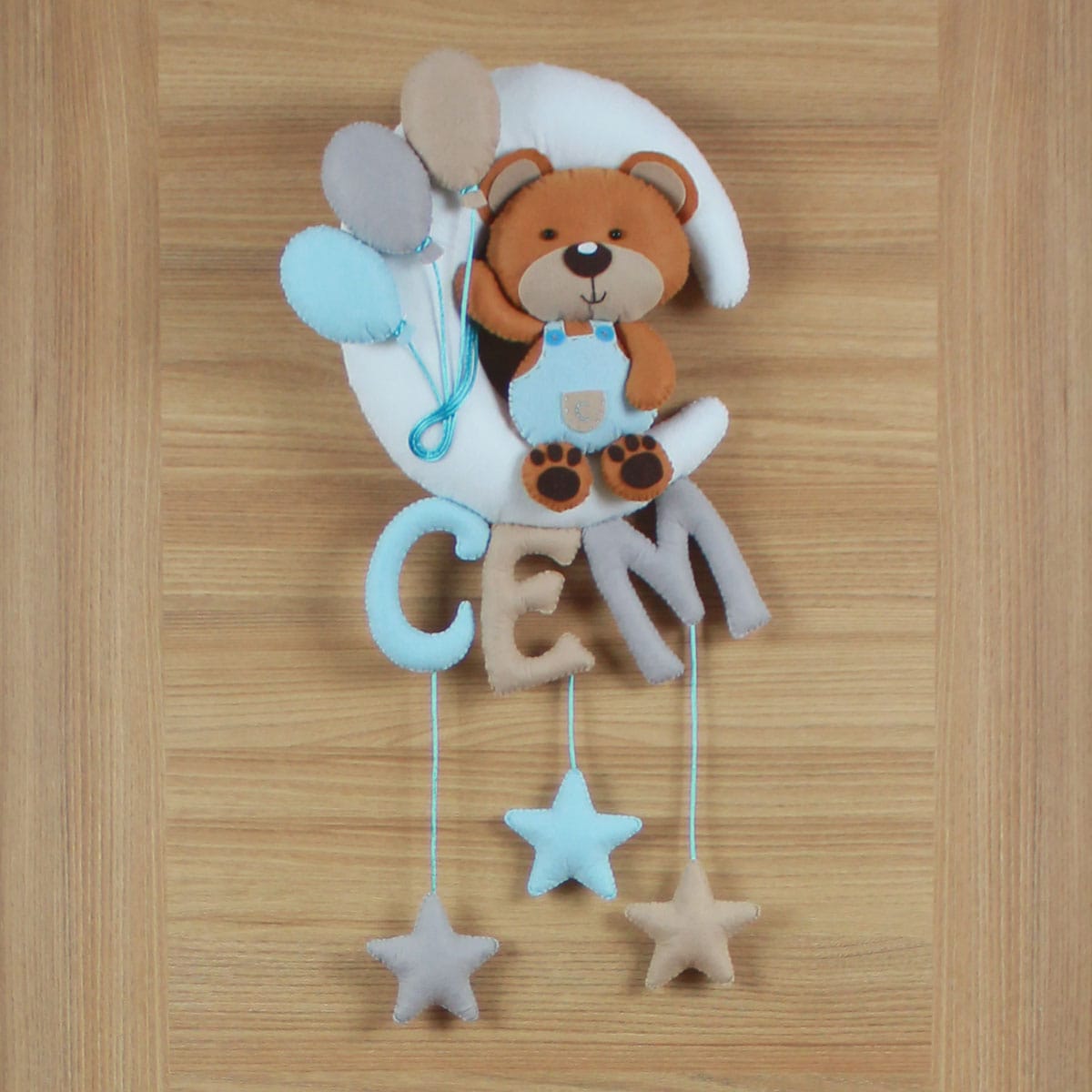 Kapı süsünün ana temasını, üst kısımda yer alan, beyaz renkli, gülen yüzlü bir hilal ay figürü oluşturuyor. Ayın üzerinde, kahverengi renkli, mavi tulumlu ve sevimli bir ayıcık figürü oturmaktadır. Ayıcığın elinde gri ve açık mavi renklerde iki adet balon bulunmaktadır. Ayın altından sarkan iplerle bağlı, açık mavi ve bej tonlarda, büyük ve belirgin harflerle yazılmış “CEM” ismi yer alıyor. İsmin altından sarkan iplerle bağlı, açık mavi ve bej renklerde iki adet yıldız figürü de tasarıma eşlik ediyor. Her bir detay, bebeğinizin odasına hayal gücünü besleyen, pozitif ve enerji dolu bir hava katıyor. “Cem” isminin taşıdığı “toplama, bir araya getirme; hükümdar” anlamı, bu kapı süsünü minik Cem’in hayat yolculuğunda aydınlık, neşeli ve başarılı bir birey olmasını temenni eden anlamlı bir armağana dönüştürüyor.