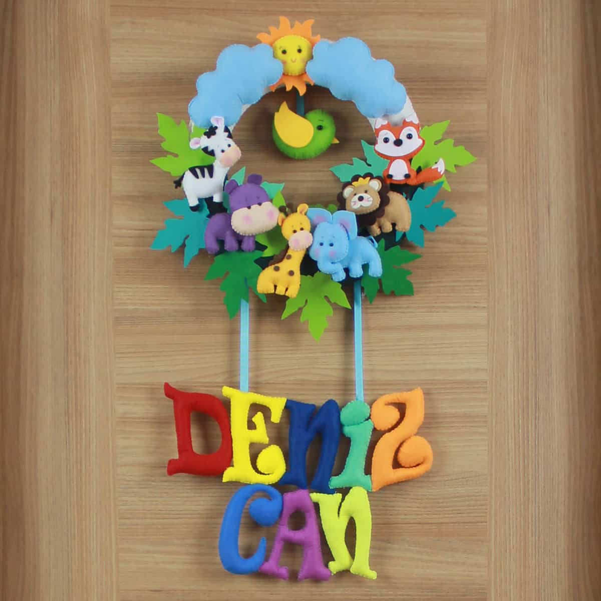 Kapı süsünün ana temasını, üst kısımda yer alan, ortasında gülen yüzlü bir güneş ve iki yanında mavi bulutların bulunduğu, yeşil yapraklı bir çelenk oluşturuyor. Çelenk üzerinde sevimli safari hayvanları figürleri bulunmaktadır: solda siyah-beyaz çizgili bir zebra, altında mor bir su aygırı, sarı benekli bir zürafa, mavi bir fil, taç takmış kahverengi bir aslan ve turuncu bir tilki yer alıyor. Çelenkin içinde, yaprakların ortasında yeşil bir kuş figürü de tasarıma eşlik ediyor. Çelenkin altından sarkan iplerle bağlı, kırmızı, sarı, yeşil, turkuaz, turuncu, mor ve sarı tonlarda, büyük ve belirgin harflerle yazılmış “DENİZ CAN” ismi yer alıyor. Her bir detay, bebeğinizin odasına hayal gücünü besleyen, pozitif ve enerji dolu bir hava katıyor. “Deniz” isminin taşıdığı “geniş su kütlesi” ve “Can” isminin taşıdığı “hayat, ruh” anlamları, bu kapı süsünü minik Deniz Can’ın hayat yolculuğunda aydınlık, neşeli ve başarılı bir birey olmasını temenni eden anlamlı bir armağana dönüştürüyor.