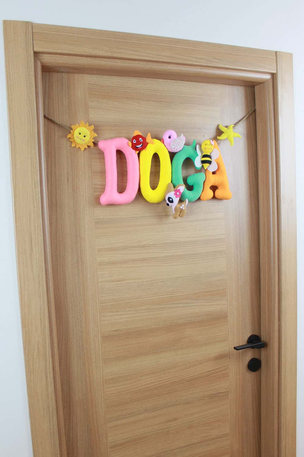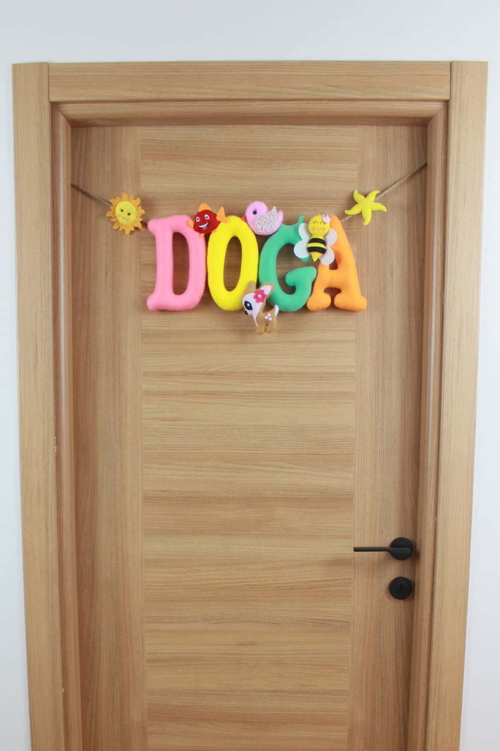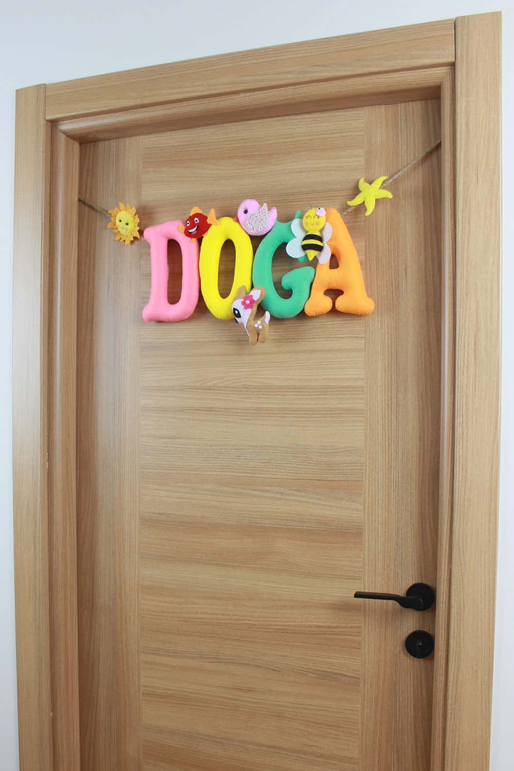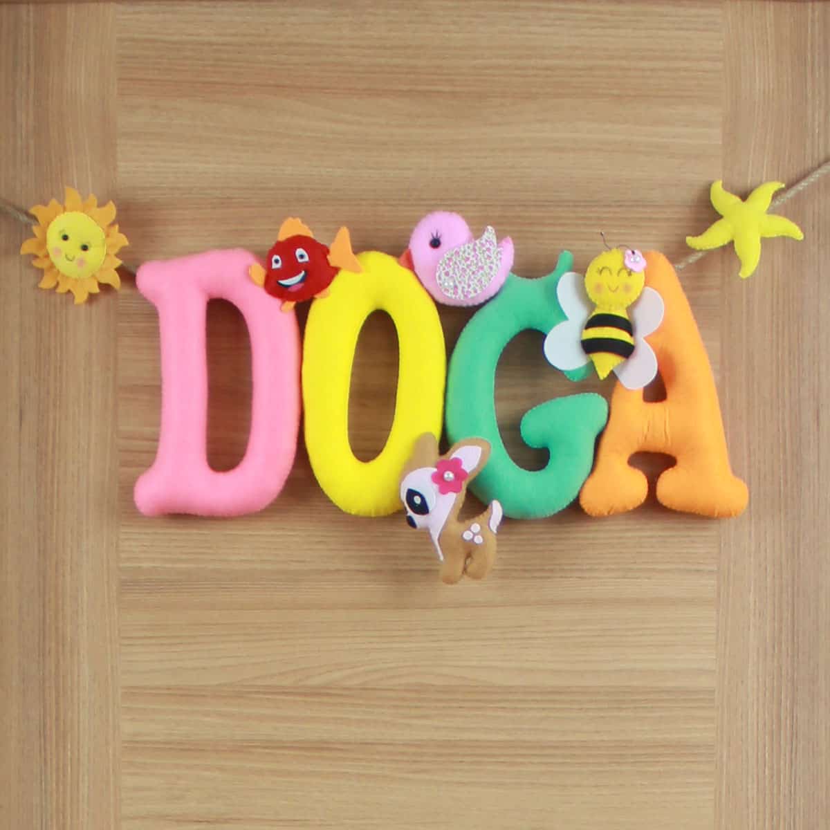 Kapı süsünün ana temasını, iplerle asılmış pembe, sarı, yeşil ve turuncu tonlarda, büyük ve belirgin harflerle yazılmış “DOĞA” ismi oluşturuyor. Her bir harfin üzerinde veya etrafında sevimli doğal figürler bulunmaktadır: “D” harfinin solunda gülen yüzlü bir güneş, “O” harfinin üzerinde kırmızı benekli bir balık, “G” harfinin üzerinde beyaz-pembe tüylü bir kuş ve “A” harfinin üzerinde sarı-siyah çizgili bir arı figürü yer alıyor. “D” harfinin sağ altında ise beyaz çiçekli ve pembe taçlı sevimli bir geyik figürü bulunmaktadır. En sağda, ipe asılı sarı bir deniz yıldızı da tasarıma eşlik ediyor. Her bir detay, bebeğinizin odasına hayal gücünü besleyen, pozitif ve enerji dolu bir hava katıyor. “Doğa” isminin taşıdığı “yaradılış ve huy özelliklerinin tümü, tabiat” anlamı, bu kapı süsünü minik Doğa’nın hayat yolculuğunda aydınlık, neşeli ve başarılı bir birey olmasını temenni eden anlamlı bir armağana dönüştürüyor.
