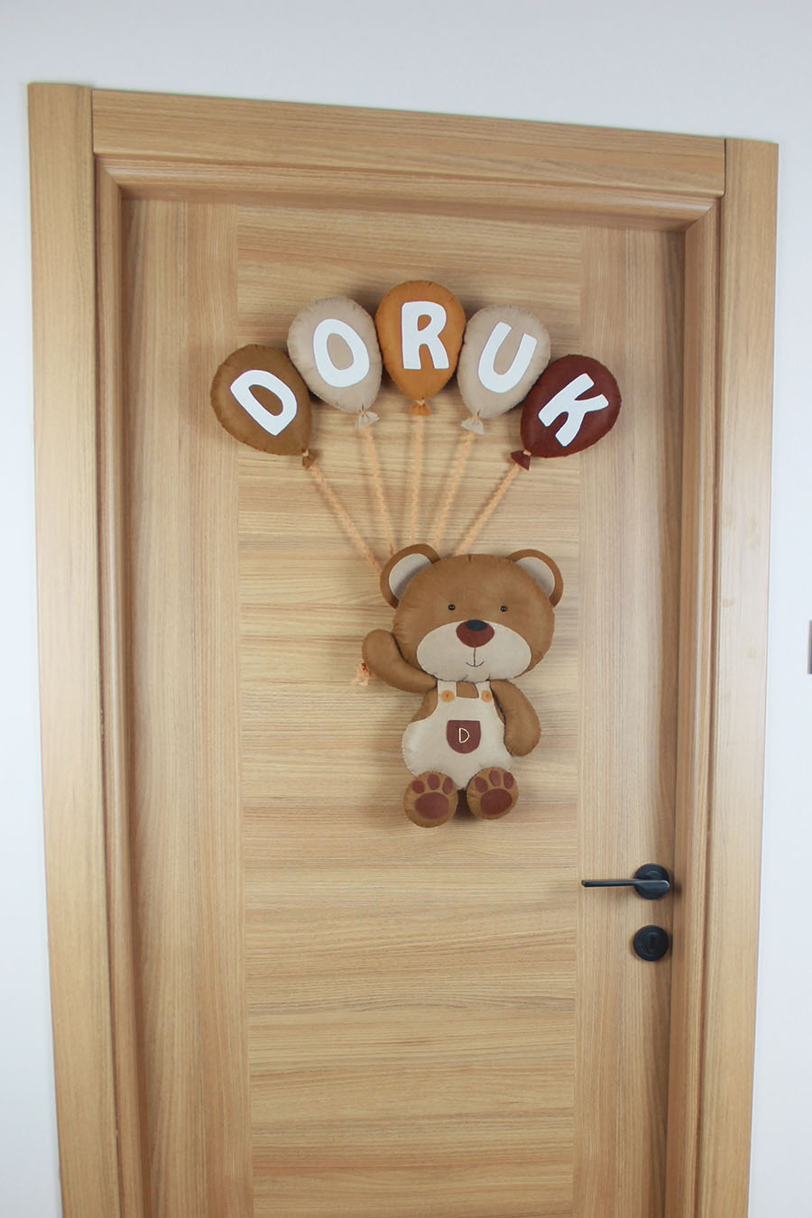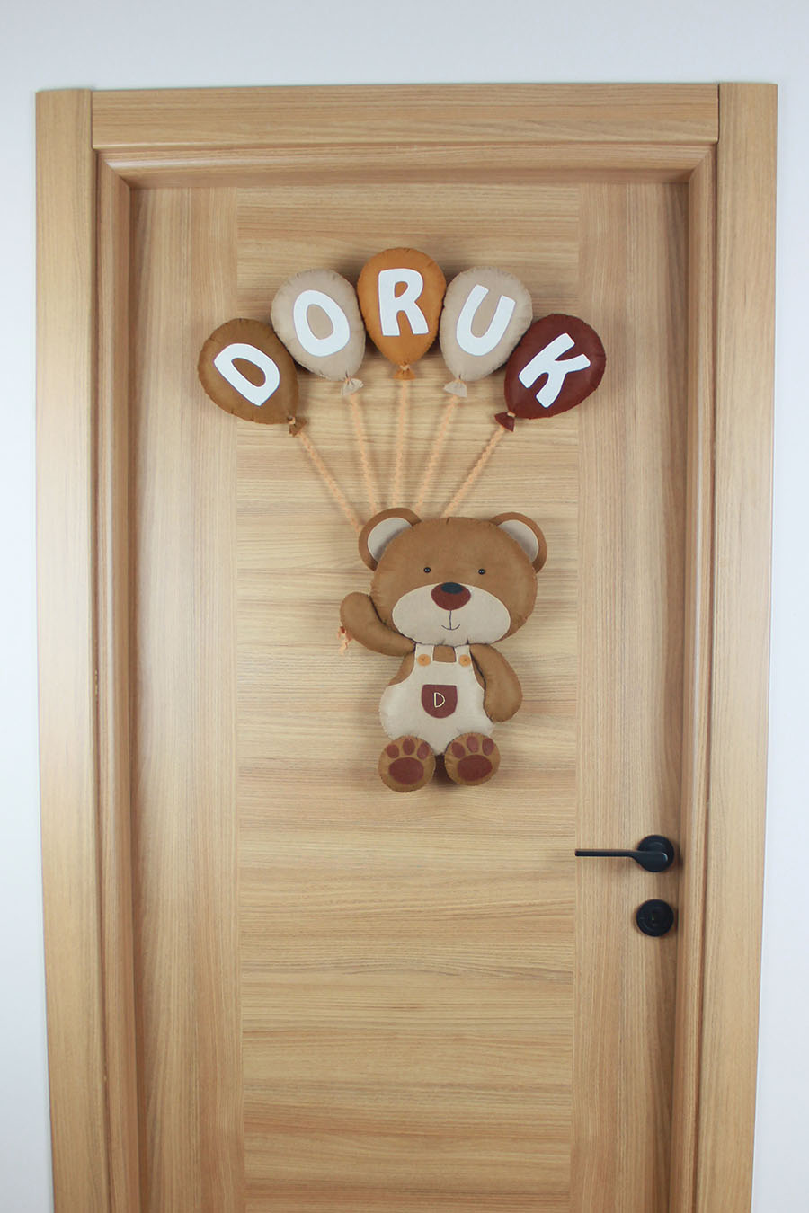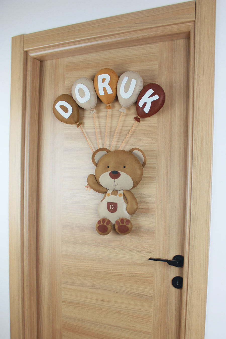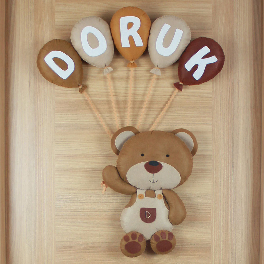 Bebeğinizin odasına ve hastane kapısına sıcak bir dokunuş katın! Doruk ismine özel olarak hazırlanan bu el yapımı keçe kapı süsü, sevimli ayıcık figürü ve harf balonları ile dikkat çeker. Toprak tonlarındaki şık tasarımıyla hem erkek bebek odaları için mükemmel bir dekorasyon objesi hem de unutulmaz bir doğum hediyesidir. Yumuşak dolgulu yapısı ve kaliteli dikiş detaylarıyla uzun ömürlü kullanım sunar.