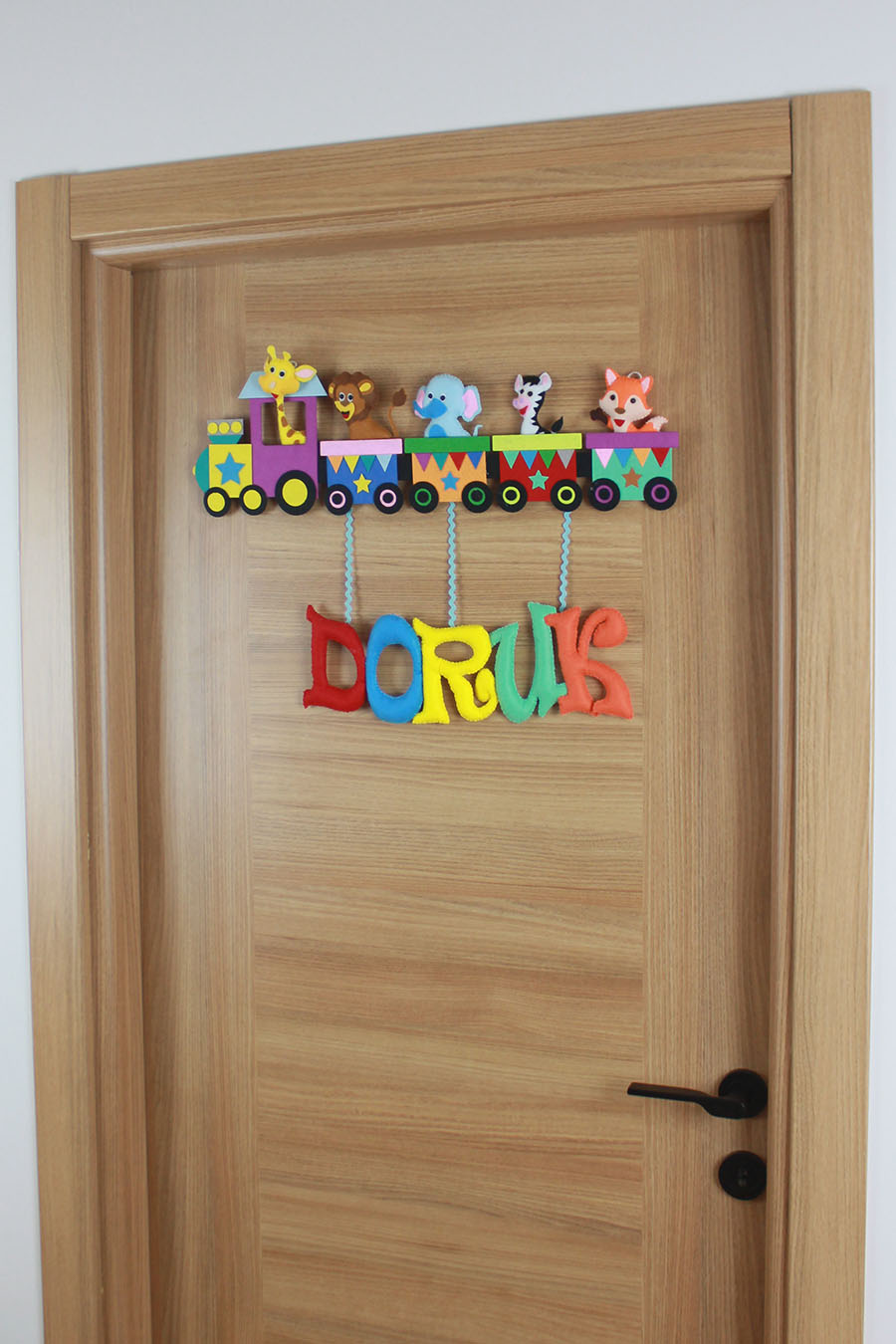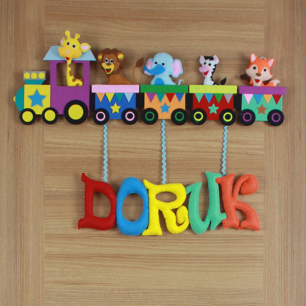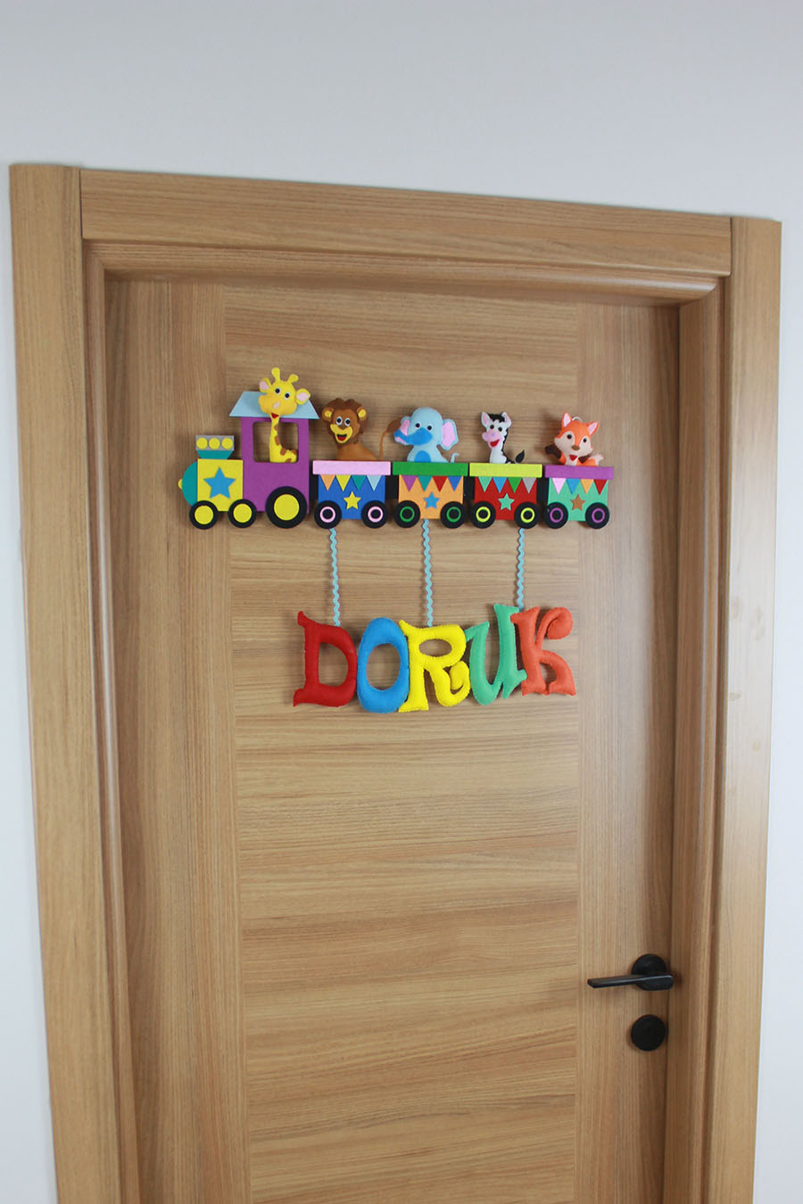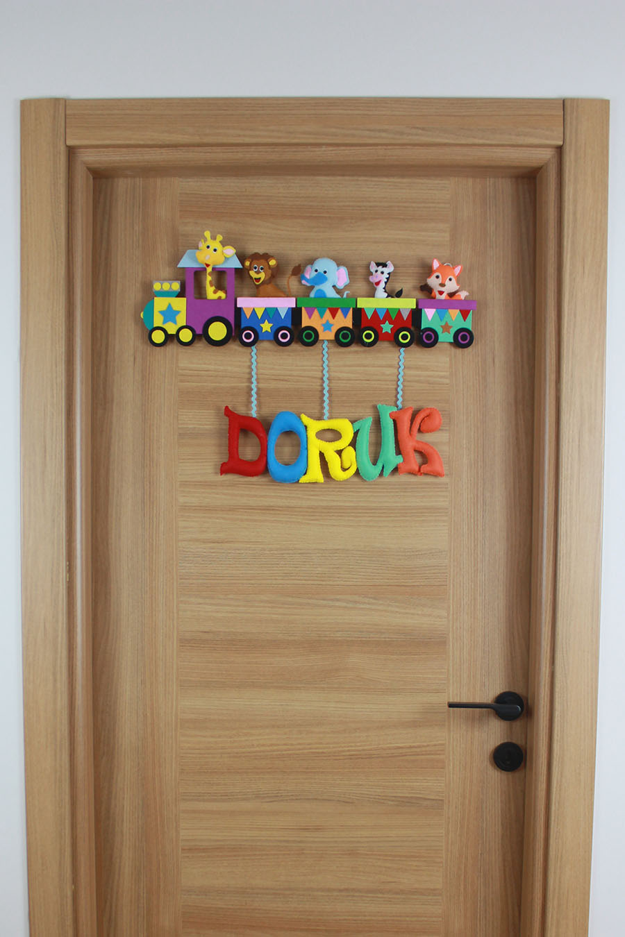 Bebeğinizin odasına eğlence dolu bir tren geliyor! Bu özel tasarımda sevimli zürafa, aslan, fil, zebra ve tilki figürleri renkli vagonlarda yolculuk ederken, Doruk ismi trenin hemen altından şık bir şekilde sarkmaktadır. Tamamen el yapımı keçe malzemeden üretilen bu model, canlı renkleri ve üç boyutlu detaylarıyla hastane odası ve bebek odası dekorasyonu için eşsiz bir seçimdir.