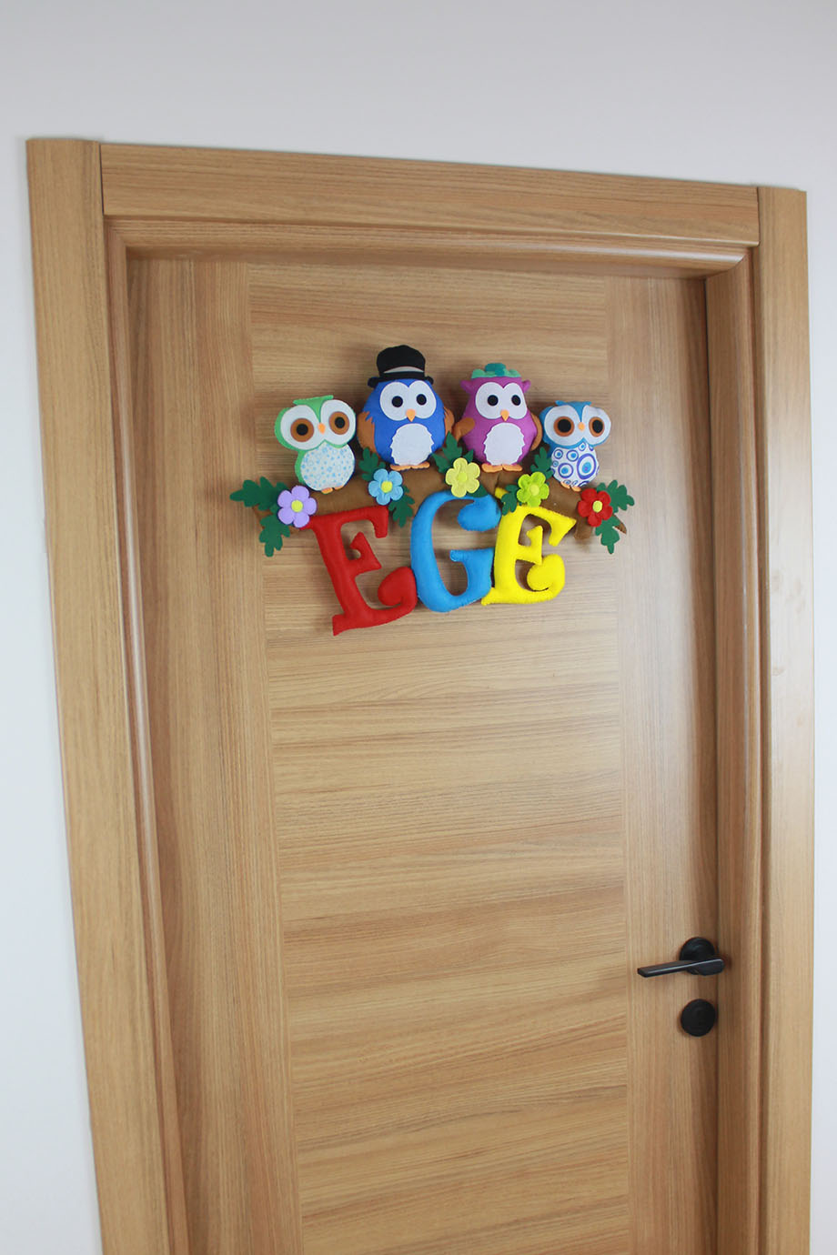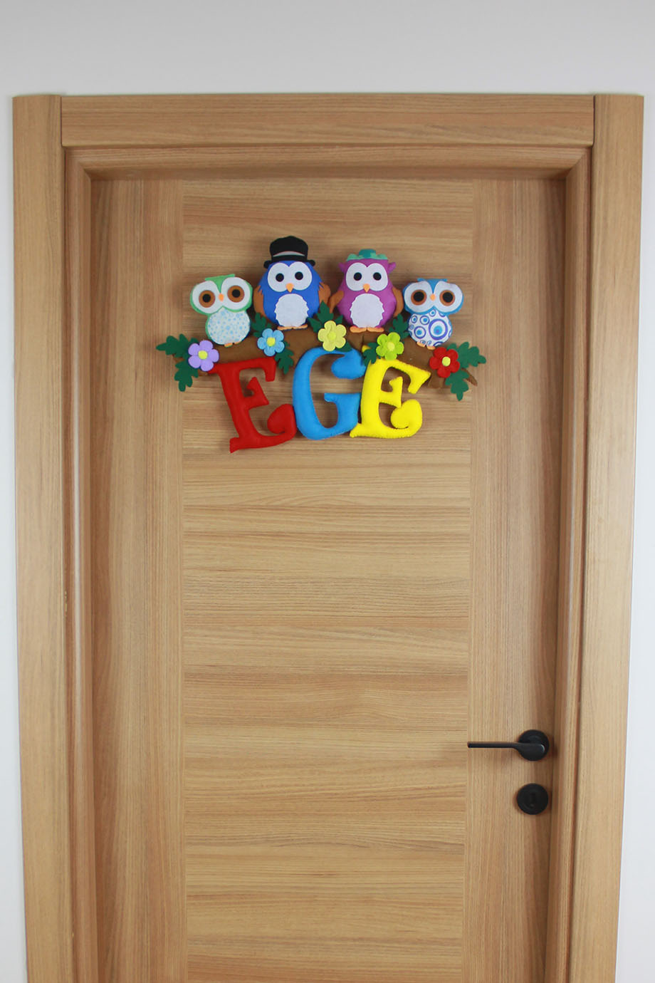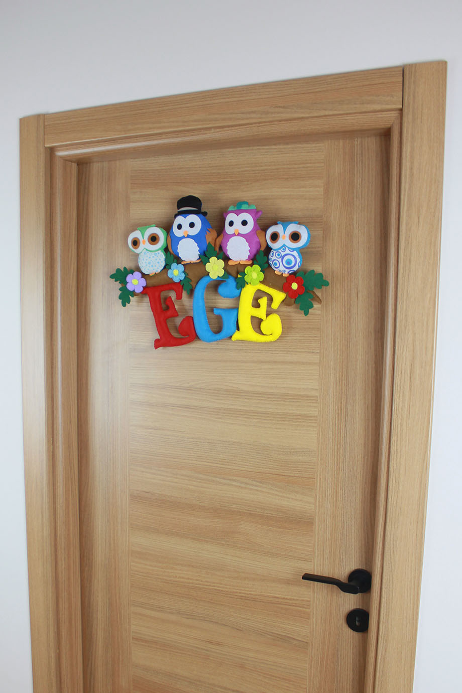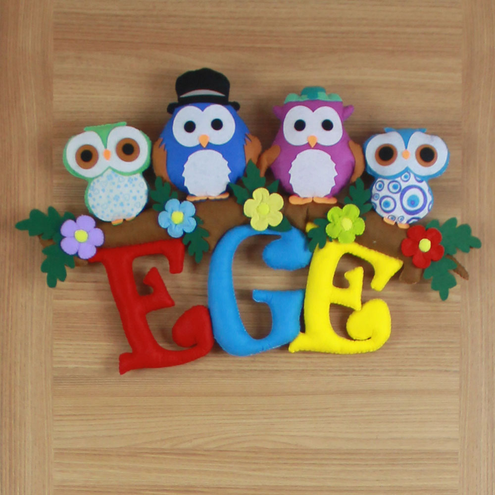 Ege bebeğin odasına neşeli bir orman dokunuşu! Bir ağaç dalı üzerinde sıralanmış, şapkalı ve çiçekli dört farklı baykuş figüründen oluşan bu kapı süsü, tamamen el yapımı keçe malzemeden üretilmiştir. Canlı kırmızı, mavi ve sarı renkli dolgulu harflerle hazırlanan “EGE” ismi, çiçek detaylarıyla bezenmiş bir dalın altında sallanmaktadır. Hastane odası karşılamaları, bebek odası dekorasyonu ve kalıcı bir doğum hediyesi için hem renkli hem de masalsı bir seçenektir.