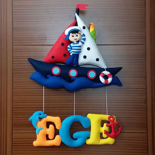 Kapı süsünün ana temasını, üst kısımda yer alan yelkenli bir gemi ve geminin üzerinde oturan sevimli bir denizci bebek figürü oluşturuyor. Koyu mavi renkli geminin kırmızı ve beyaz renklerde yelkenleri bulunmaktadır. Beyaz yelkende siyah benekler, kırmızı yelkende ise yine siyah benekler yer alıyor. Geminin üzerinde küçük bir papağan figürü ve geminin gövdesinde yuvarlak pencereler ve bir can simidi detayı bulunmaktadır. Gemi, altında mavi dalga formlarıyla denizde yüzüyormuş gibi görünmektedir. Geminin altından sarkan iplerle bağlı, rengarenk tonlarda, büyük ve belirgin harflerle yazılmış “EGE” ismi yer alıyor. Harfler sırasıyla turuncu, mavi ve sarı renktedir. Turuncu “E” harfinin yanında mavi bir yunus, sarı “E” harfinin yanında ise kırmızı bir çapa figürü bulunmaktadır. Her bir detay, bebeğinizin odasına hayal gücünü besleyen, pozitif ve enerji dolu bir hava katıyor. “Ege” isminin taşıdığı “bir çocuğun veliliği, büyüğü” veya “sahip, ulu” anlamları, bu kapı süsünü minik Ege’nin hayat yolculuğunda aydınlık, neşeli ve başarılı bir birey olmasını temenni eden anlamlı bir armağana dönüştürüyor.