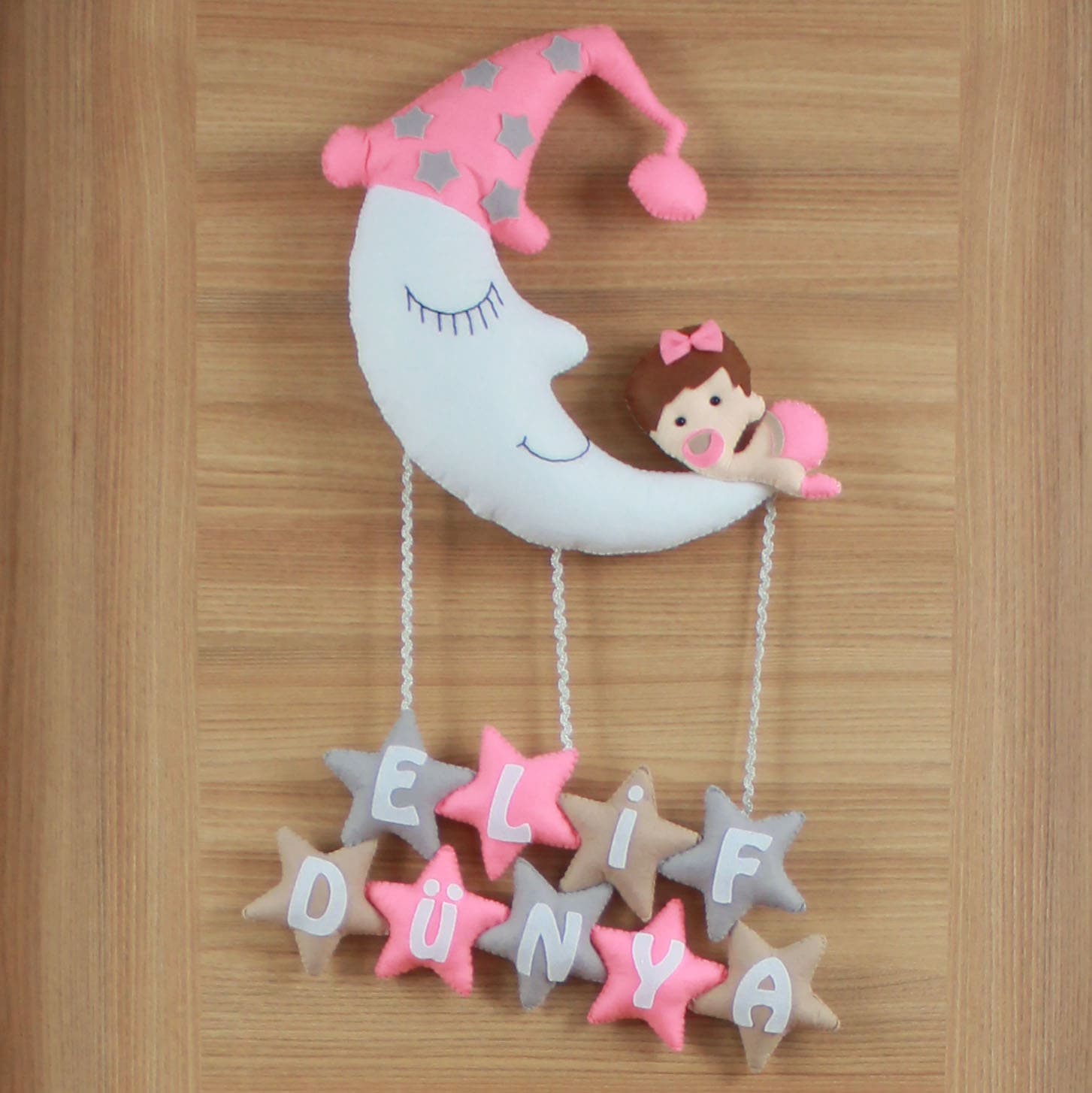 Kapı süsünün ana temasını, üst kısımda yer alan, pembe uyku şapkalı, gözleri kapalı, gülümseyen sevimli bir ay dede figürü oluşturuyor. Ay dedenin üzerinde pembe kurdeleli ve başındaki kalpli sevimli bir kız bebek figürü uyumaktadır. Ay dedenin altından sarkan iplerle bağlı, on adet yıldız figürü bulunmaktadır. Yıldızlar pembe, bej ve gri tonlardadır ve üzerinde beyaz harflerle “ELİF DÜNYA” ismi yazmaktadır. Her bir detay, bebeğinizin odasına hayal gücünü besleyen, pozitif ve huzurlu bir hava katıyor. “Elif” isminin taşıdığı “ince, uzun boylu, güzel” ve “Dünya” isminin taşıdığı “varlık, yaşam alanı, yeryüzü” anlamları, bu kapı süsünü minik Elif Dünya’nın hayat yolculuğunda aydınlık, neşeli ve başarılı bir birey olmasını temenni eden anlamlı bir armağana dönüştürüyor.