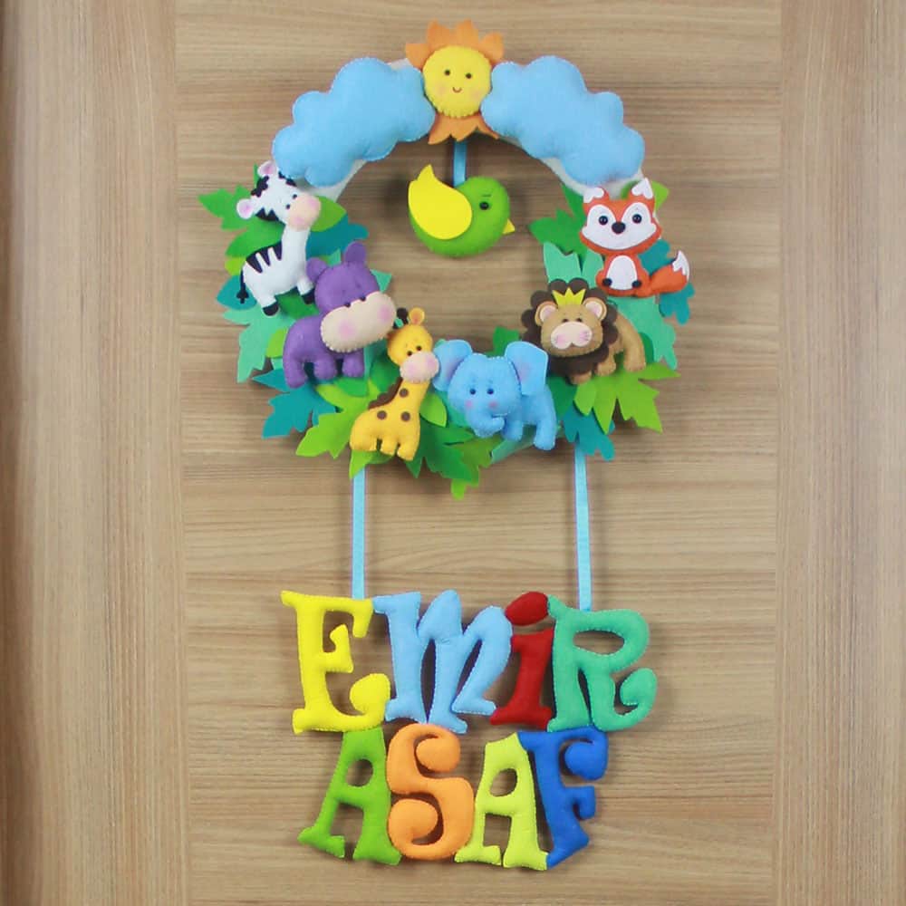 Kapı süsünün ana temasını, üzerinde çeşitli sevimli safari hayvanlarının bulunduğu yemyeşil yapraklardan oluşan bir çelenk oluşturuyor. Çelenkin üzerinde, gülen yüzlü sevimli bir güneş ve iki adet açık mavi bulut bulunmaktadır. Çelenkin içinde, sarı gagalı ve kanatlı, mavi bir kuş figürü yer alıyor. Çelenkte yer alan hayvanlar arasında zebra, su aygırı, zürafa, fil, aslan ve tilki bulunmaktadır. Çelenkin altından sarkan iplerle bağlı, sarı, açık mavi, kırmızı, yeşil, turuncu ve mor tonlarda, büyük ve belirgin harflerle yazılmış “EMİR ASAF” isimleri yer alıyor. Her bir detay, bebeğinizin odasına hayal gücünü besleyen, pozitif ve enerji dolu bir hava katıyor. “Emir” isminin taşıdığı “buyurgan, komutan, hükümdar” ve “Asaf” isminin taşıdığı “vezir, danışman, toplayıcı, düzenleyici” anlamları, bu kapı süsünü minik Emir Asaf’ın hayat yolculuğunda aydınlık, neşeli ve başarılı bir birey olmasını temenni eden anlamlı bir armağana dönüştürüyor.