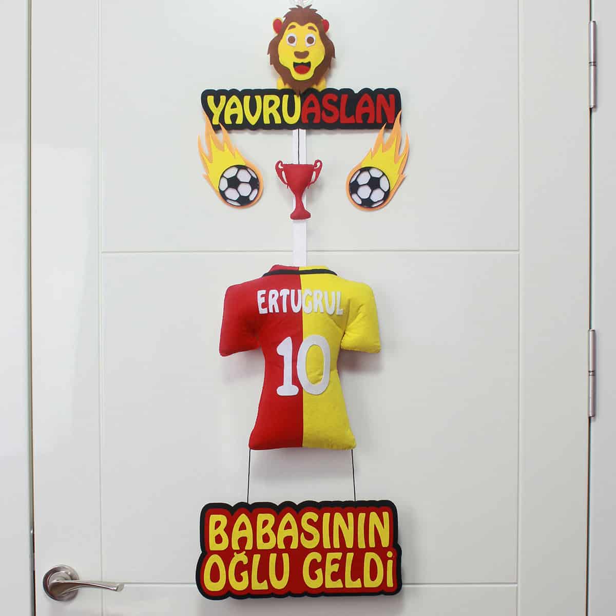 Şimdi keşfedin ve bu benzersiz bebek kapı süsü ile Ertuğrul’un odasına geleceğe dair umutları, şampiyonluk azmini ve sarı kırmızı sevdalı bir ruhu taşıyın. El yapımı bu değerli ürünle, minik misafirlerinize özgün ve anlam yüklü bir karşılama hazırlayın. Hayallerinizi somutlaştırın, çünkü küçük fanatiğinize en anlamlı dokunuş bu büyülü süste saklı! Minik Ertuğrul’a özel, azim ve başarı dolu bir gelecekle sadece sizin için tasarlandı.