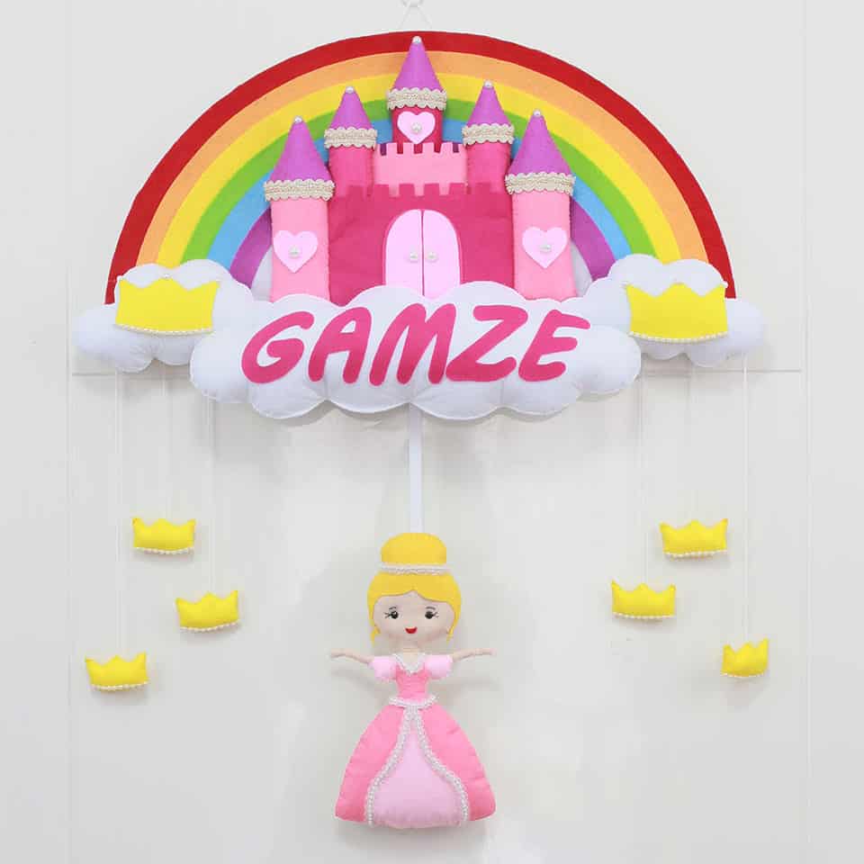 Kapı süsünün ana temasını, üst kısımda yer alan, büyük ve rengarenk bir gökkuşağı figürü oluşturuyor. Gökkuşağının altında, pembe tonlarında, sivri çatılı ve kalp detaylı kuleleriyle görkemli bir şato figürü bulunmaktadır. Şatonun altında, beyaz renkli bulutlar ve bu bulutların üzerinde iki adet sarı prenses tacı yer alıyor. Ortada, bulutların üzerinde, büyük ve belirgin harflerle yazılmış “GAMZE” ismi bulunmaktadır. “GAMZE” isminin altından sarkan iple bağlı, pembe elbise giymiş, sarı saçlı, sevimli bir prenses figürü yer alıyor. Prenses figürünün etrafında, sarkan iplerle bağlı küçük sarı taç figürleri de mevcuttur. Her bir detay, bebeğinizin odasına hayal gücünü besleyen, pozitif ve enerji dolu bir hava katıyor. “Gamze” isminin taşıdığı “yanakta beliren çukurluk, tebessüm” anlamı, bu kapı süsünü minik Gamze’nin hayat yolculuğunda neşeli, güzel ve başarılı bir birey olmasını temenni eden anlamlı bir armağana dönüştürüyor.