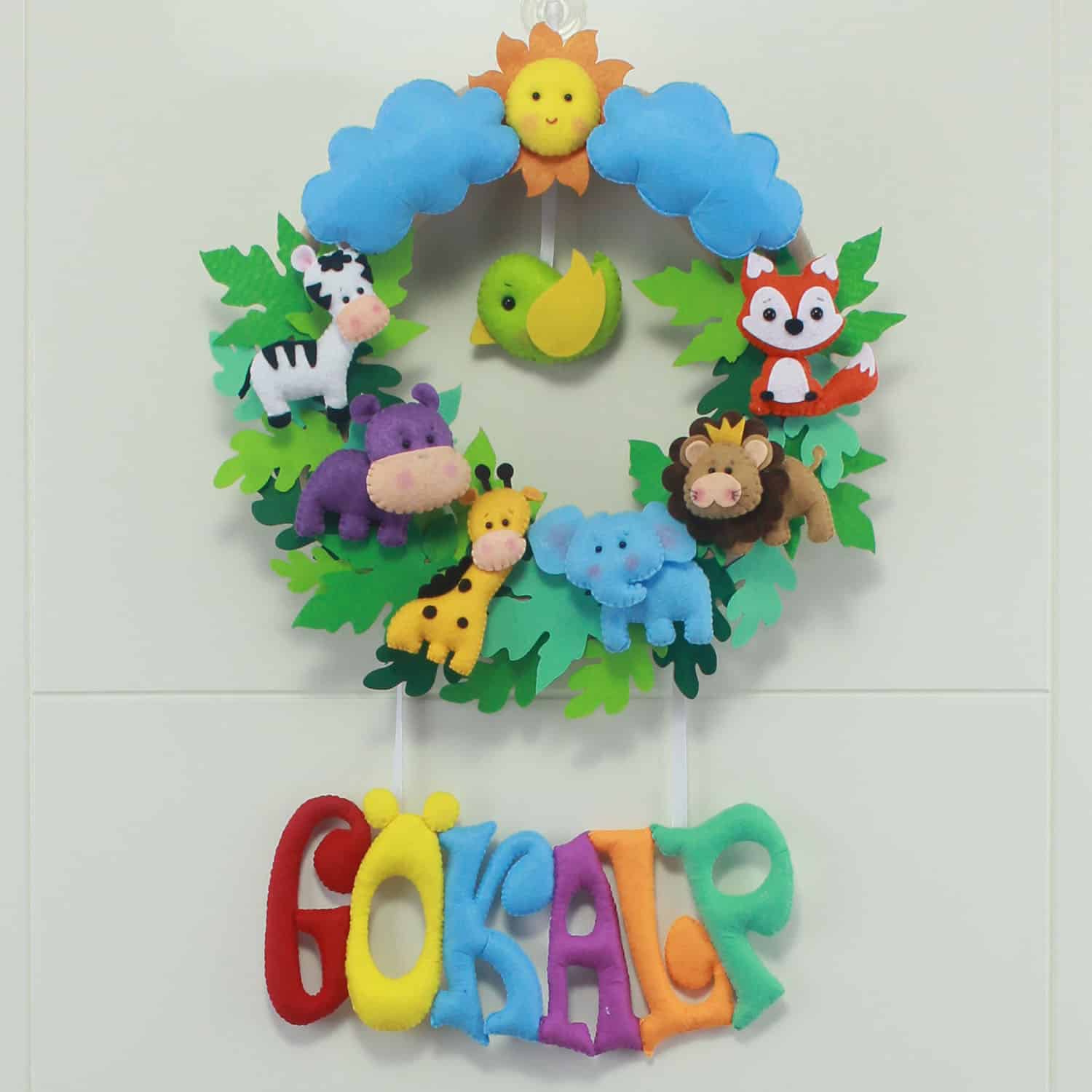 Kapı süsünün ana temasını, ortasında yeşil yapraklarla süslenmiş yuvarlak bir halka oluşturuyor. Halkanın üst kısmında, gülen yüzlü sevimli bir güneş ve mavi bulutlar yer alıyor. Halkanın içine ve etrafına, farklı noktalara konumlandırılmış sevimli safari hayvanları figürleri bulunuyor: zebra, su aygırı, zürafa, mavi fil, aslan, tilki ve kuş. Halkanın altından sarkan iplerle bağlı, rengarenk tonlarda, büyük ve belirgin harflerle yazılmış “GÖKALP” ismi yer alıyor. Her bir detay, bebeğinizin odasına hayal gücünü besleyen, pozitif ve enerji dolu bir hava katıyor. “Gökalp” isminin taşıdığı “gök mavisi, yiğit, kahraman” anlamları, bu kapı süsünü minik Gökalp’in hayat yolculuğunda aydınlık, cesur ve başarılı bir birey olmasını temenni eden anlamlı bir armağana dönüştürüyor.