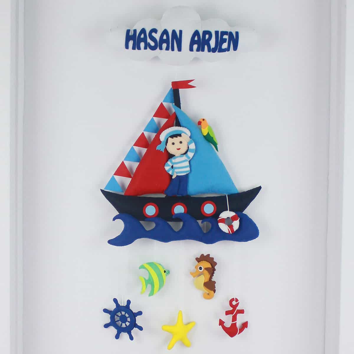 Kapı süsünün ana temasını, üst kısımda yer alan, beyaz bir bulut ve bulutun altında mavi harflerle yazılmış “HASAN ARJEN” ismi oluşturuyor. İsmin altından sarkan iplerle bağlı, kırmızı ve mavi yelkenli tekne figürü yer alıyor. Teknenin yelkenleri kırmızı, mavi ve beyaz üçgen desenli olup, üzerinde denizci şapkası ve çizgili tişört giymiş sevimli bir bez bebek figürü bulunuyor. Yelkenlerin üzerinde yeşil ve kırmızı renklerde bir papağan figürü de yer almaktadır. Teknenin alt kısmında mavi dalgalar ve can simidi detayı mevcuttur. Teknenin altından sarkan iplerle bağlı, yeşil ve sarı çizgili bir balık, sarı bir denizatlı, mavi bir dümen, sarı bir denizyıldızı ve kırmızı bir çapa figürü bulunmaktadır. Her bir detay, bebeğinizin odasına hayal gücünü besleyen, pozitif ve huzurlu bir hava katıyor. “Hasan” isminin taşıdığı “güzel, iyi, hayırlı” ve “Arjen” isminin taşıdığı “ateşli, cesur” anlamları, bu kapı süsünü minik Hasan Arjen’in hayat yolculuğunda cesur, iyi kalpli ve başarılı bir birey olmasını temenni eden anlamlı bir armağana dönüştürüyor.