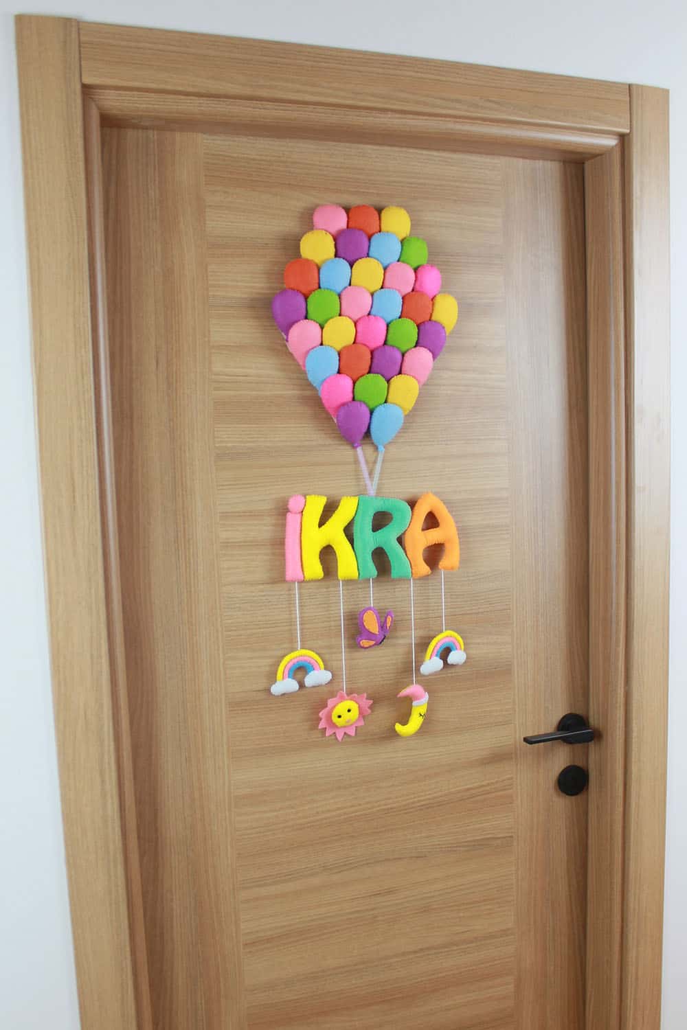 Kapı süsünün ana temasını, üst kısımda yer alan, mor, pembe, sarı, turuncu, mavi ve yeşil tonlarında bir araya getirilmiş çok sayıda balondan oluşan büyük bir balon demeti oluşturuyor. Balon demetinin altından sarkan iplerle bağlı, pembe, sarı, yeşil, turuncu ve açık mavi tonlarında, büyük ve belirgin harflerle yazılmış “İKRA” ismi yer alıyor. İsmin altından sarkan iplerle ise sevimli figürler bulunmaktadır: pembe bir kelebek, iki adet gökkuşağı ve bulut, gülen yüzlü bir güneş ve uyuyan hilal ay figürü. Her bir detay, bebeğinizin odasına hayal gücünü besleyen, pozitif ve enerji dolu bir hava katıyor. “İkra” isminin taşıdığı “oku, öğren” anlamları, bu kapı süsünü minik İkra’nın hayat yolculuğunda bilgili, meraklı ve başarılı bir birey olmasını temenni eden anlamlı bir armağana dönüştürüyor.