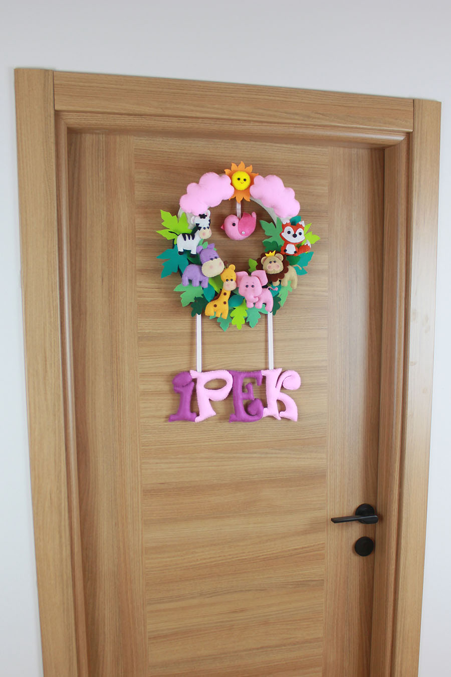 Küçük kaşifiniz İpek’in odasına egzotik bir atmosfer katın! Tamamen el yapımı keçe süs, pembe ve yeşil tonlarda tasarlanmış dairesel bir halka üzerinde sevimli safari hayvanları (fil, zürafa, zebra, maymun vb.) ve tropikal yaprak figürlerini bir araya getiriyor. Alt kısımda canlı pembe renklerde “İPEK” ismi asılıdır. Safari veya orman temalı bebek/çocuk odaları için mükemmel bir dekoratif unsurdur. Hastane odası süslemesi, bebek odası dekoru ve doğum hediyesi olarak kalıcı, neşeli ve kişisel bir anıdır.