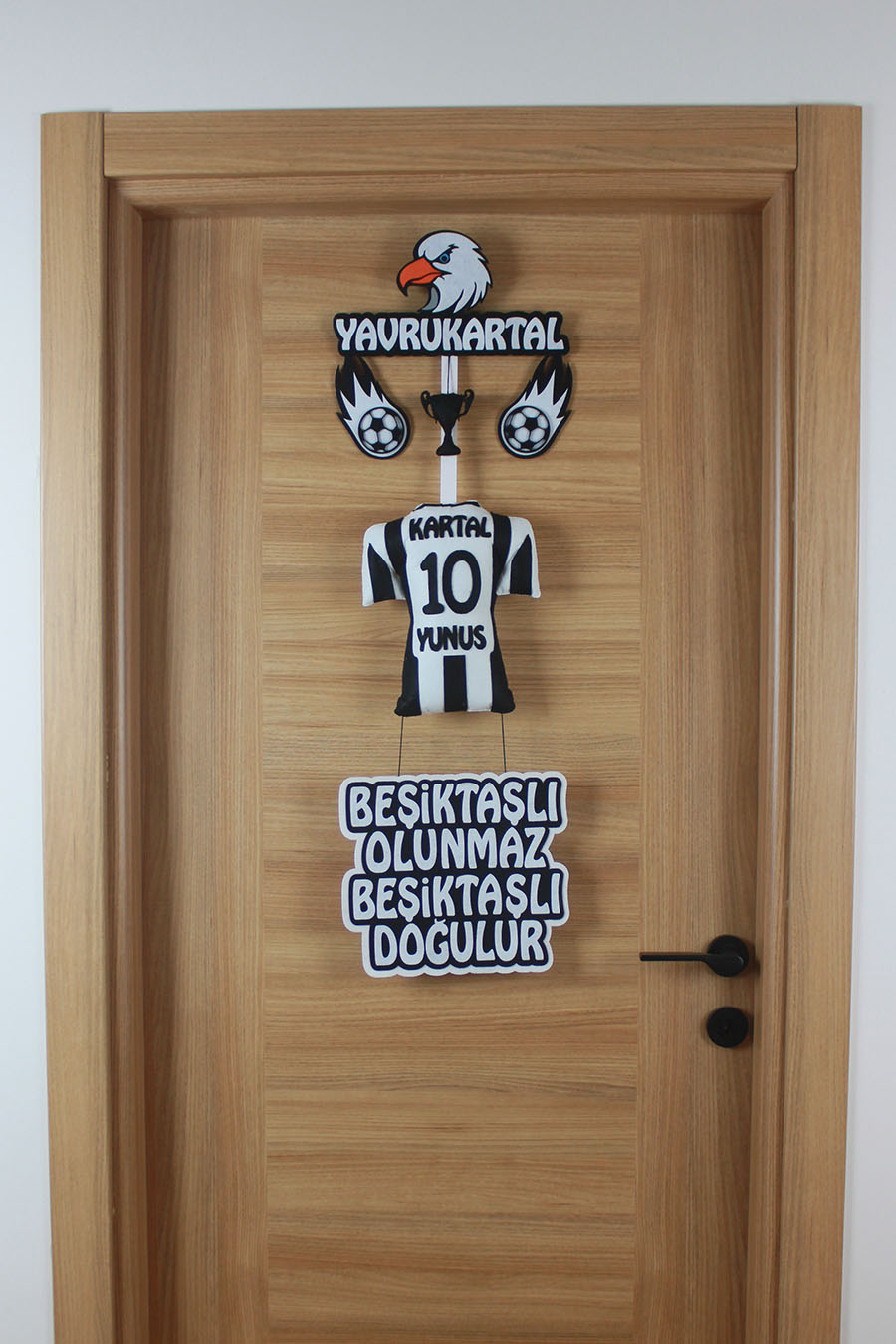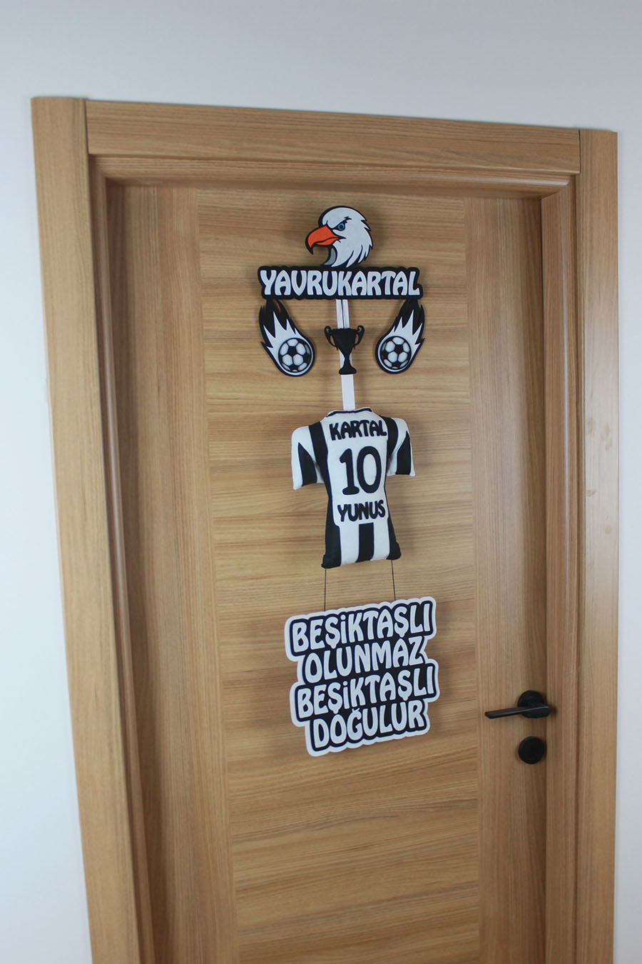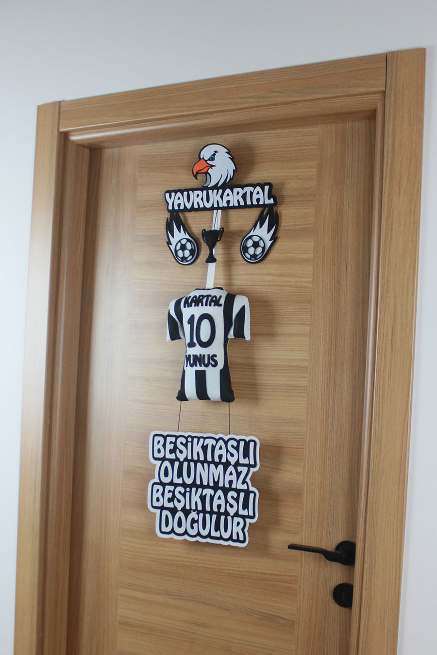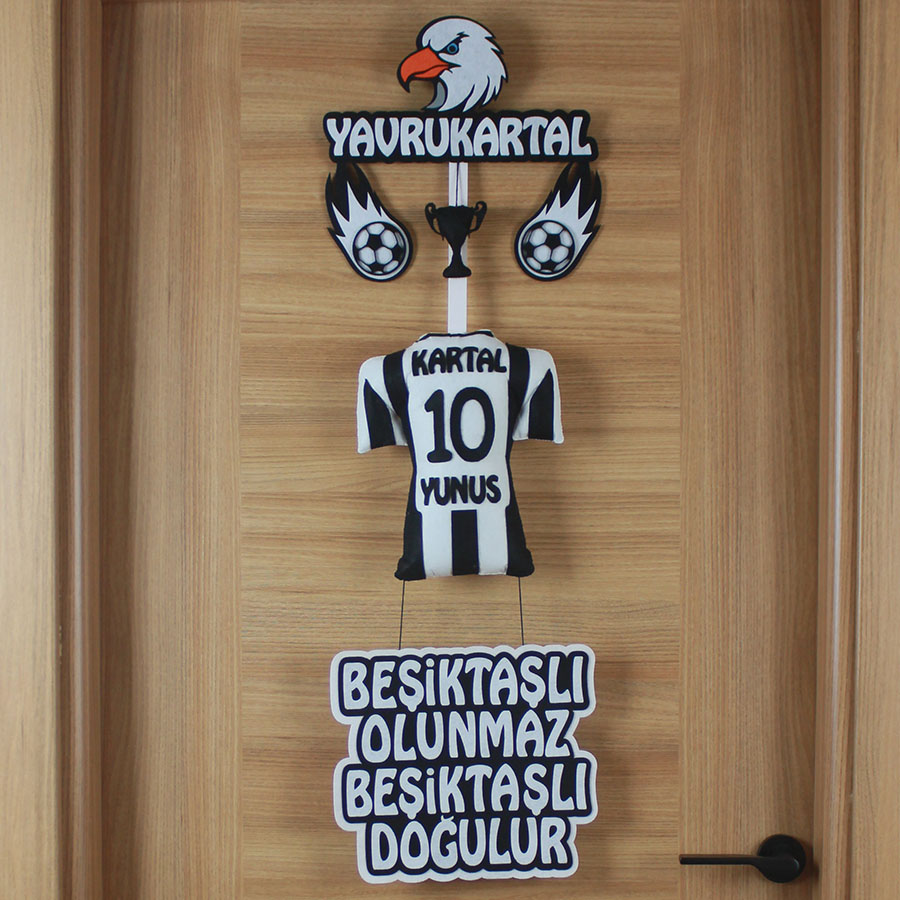 Evinizde başlayan bu şanlı serüvenin o tatlı neşesi ve tarifsiz coşkusu, sanki şampiyonluk tezahüratları gibi her yana yayılıyor! Bu özel tasarım kapı süsü, “Hoş geldin Kartal Yunus, sen bizim en büyük gücümüzsün!” diyen sıcak ve samimi bir karşılama olacak. Herkesi, onun o minicik varlığından taşan büyük sevgiye, ailenizin yaşadığı o tarifsiz mutluluğa ve Beşiktaş sevdasının bu en yiğit mirasçısına ortak olmaya davet edecek.