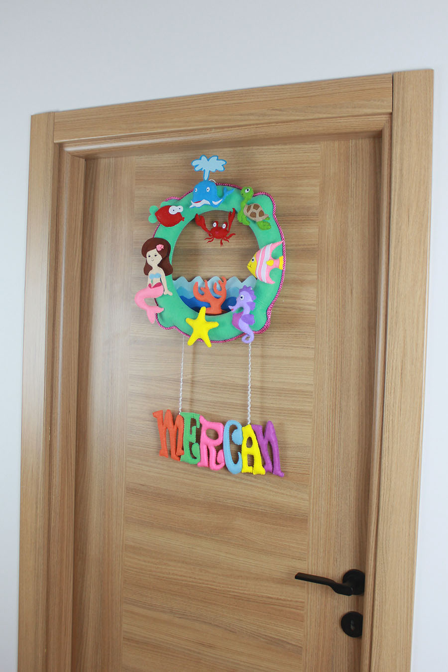 Bebeğinizin odasına denizin neşesini taşıyın! Tamamen el yapımı, canlı renkli keçeden üretilmiş bu özel kapı süsü, deniz kızı, yengeç, deniz yıldızı ve balık figürleriyle süslü bir çelenk içinde “MERCAN” ismini taşıyor. Yuvarlak çelenk formu ve sarkıt harfleriyle odanın atmosferini anında değiştirir. Hastane odası, bebek odası dekorasyonu ve deniz temalı partiler için idealdir. Kişiselleştirilmiş bu süs, uzun yıllar saklanabilecek eşsiz bir hatıra ve hediyedir.