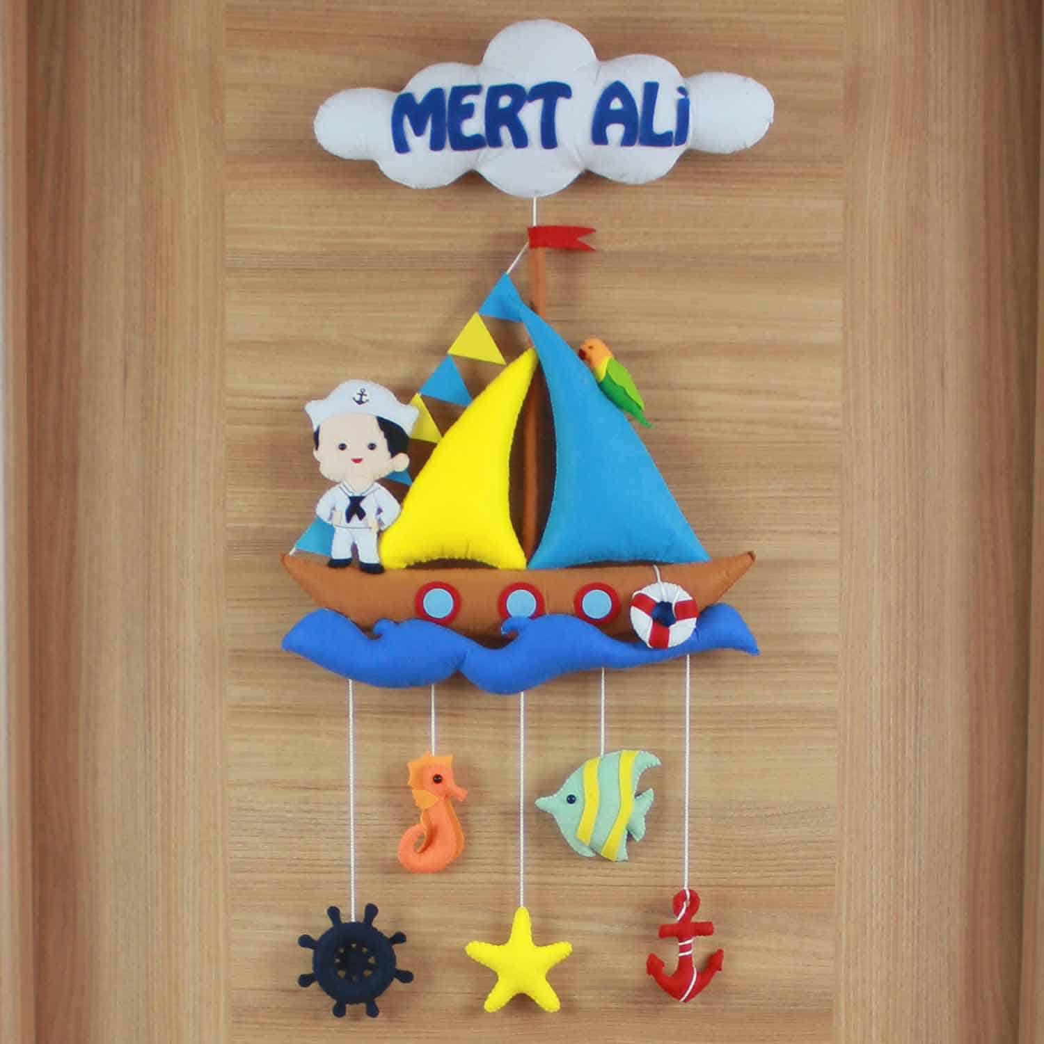 Kapı süsünün üst kısmında, beyaz bir bulut figürü ve üzerinde mavi harflerle “MERT ALİ” ismi yer alıyor, bu da tasarıma kişisel bir dokunuş katıyor. Bulutun altından sarkan iplerle bağlı, kahverengi gövdeli, mavi ve sarı yelkenli şirin bir gemi figürü bulunuyor. Geminin üzerinde beyaz bir denizci kıyafeti ve şapkasıyla gülen yüzlü sevimli bir bebek figürü yer alıyor. Geminin etrafında dalgalar, can simidi ve küçük bir papağan figürü de süslemeye canlılık katıyor. En alt kısımda ise turuncu denizatı, çizgili balık, mavi dümen, sarı yıldız ve kırmızı çapa gibi deniz temalı figürler sallanıyor, bu da tasarıma denizin derinliklerinden esintiler getiriyor. “Mert” isminin taşıdığı “yiğit, cesur” ve “Ali” isminin taşıdığı “yüce, yüksek, şerefli” anlamları, bu kapı süsünü minik Mert Ali’nin hayat yolculuğunda cesur, yüce ve keşfetmeye hevesli bir birey olmasını temenni eden anlamlı bir armağana dönüştürüyor.