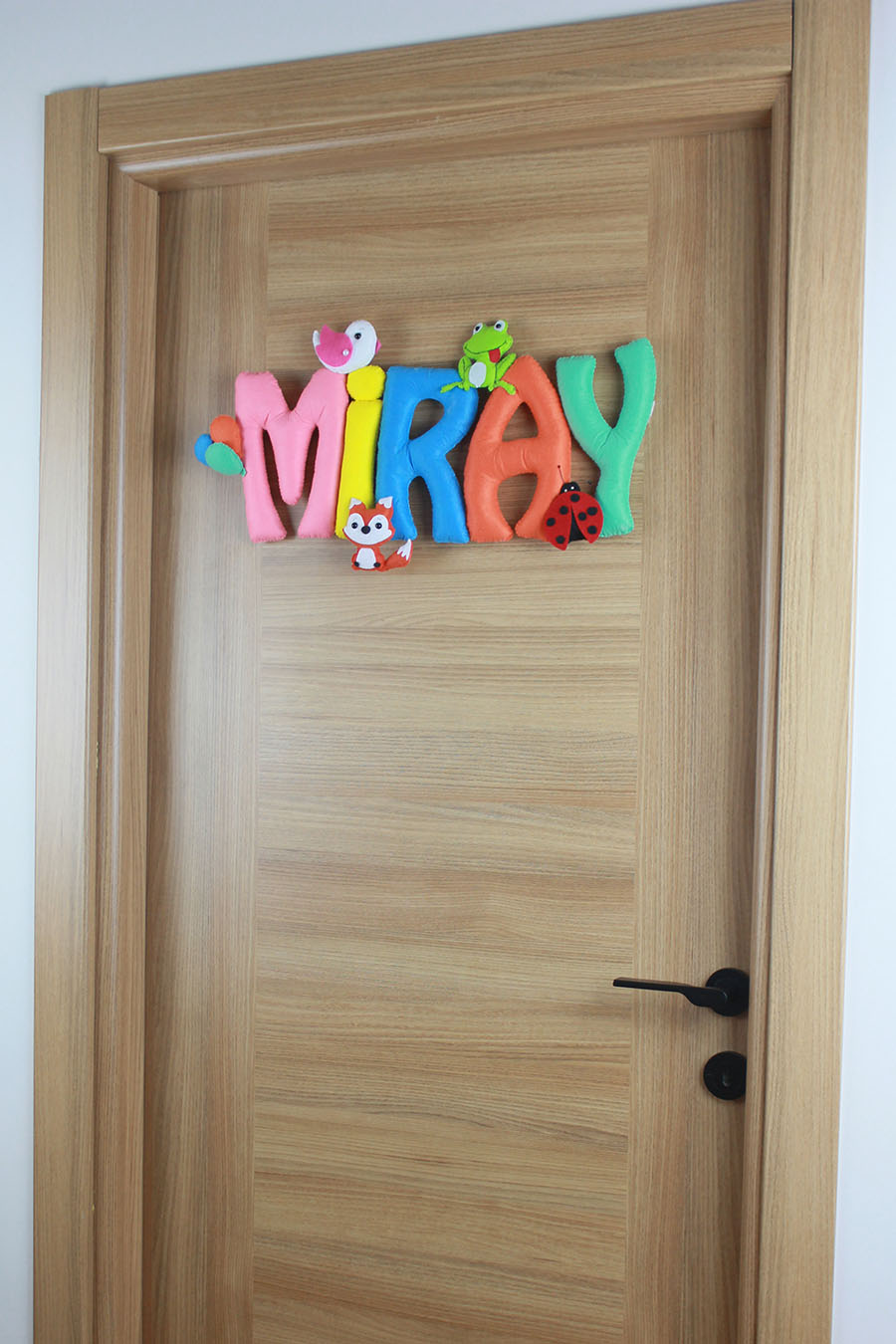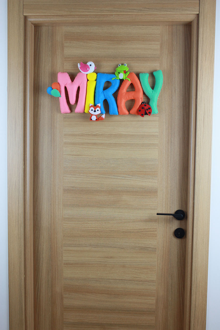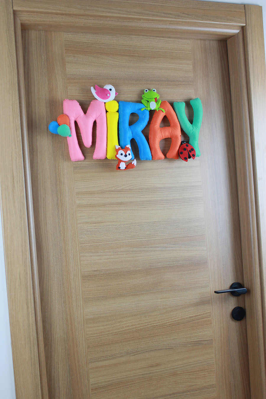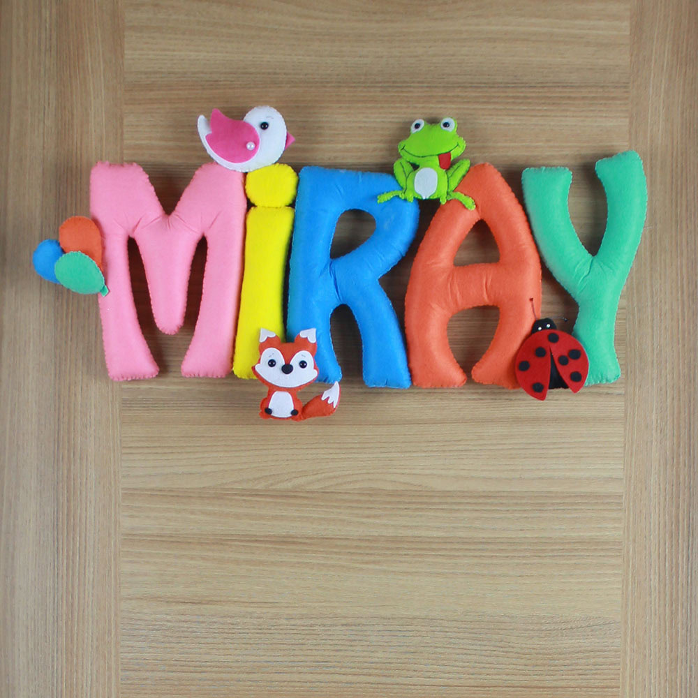 Bebeğinizin odasına renkli bir dokunuş! Miray ismiyle özel olarak hazırlanan bu kapı süsü; sevimli tilki, kurbağa, kuş ve uğur böceği figürleriyle bezeli, tamamen el yapımı bir tasarımdır. Yumuşak dolgulu keçe harfler ve canlı renkleri ile hem hastane odası süslemesinde hem de bebek odası dekorasyonunda fark yaratır. Doğal ve sıcak bir karşılama isteyen aileler için mükemmel bir hediye seçeneğidir.