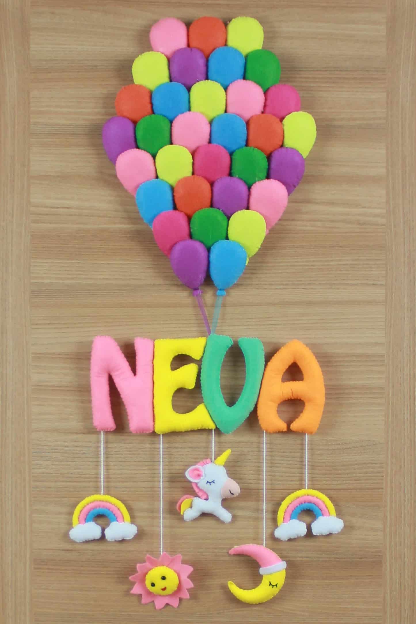 Balonlar Pastel Kapı Süsü; Keçeden elyaf dolgulu yumuşak pastel renklerinde 29 adet balon, balonlar altında elyaf dolgulu pofuduk harflerle isim yazılır. İsim altında gökkuşağı, pony, güneş, aydede ve bulut figürleri bulunur.