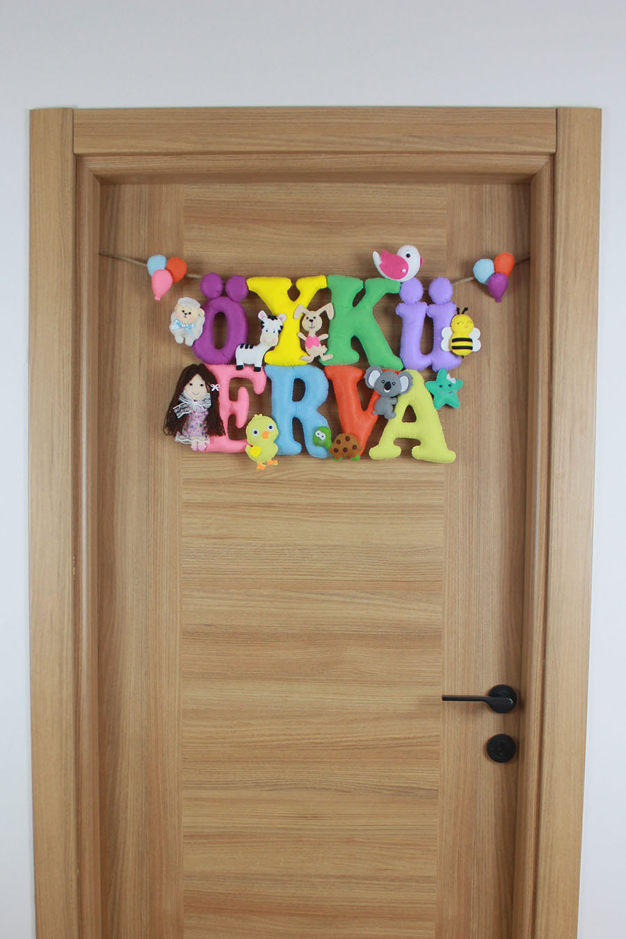 Bebeğinizin ilk günlerine eşlik edecek en renkli hatıra! Öykü Erva ismine özel hazırlanan bu kapı süsü; sevimli koala, zürafa, tavşan, arı ve bebek figürleriyle adeta bir masal dünyası sunuyor. Tamamen el yapımı, yumuşak dolgulu keçeden üretilen bu tasarım, hastane odası kapısında göz alıcı bir duruş sergilerken, sonrasında bebek odası duvarlarını süslemeye devam eder.