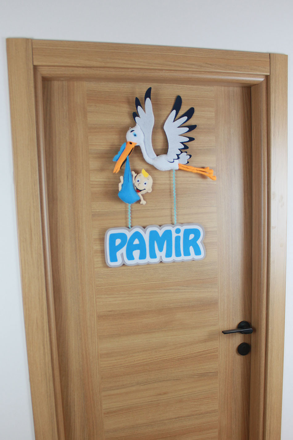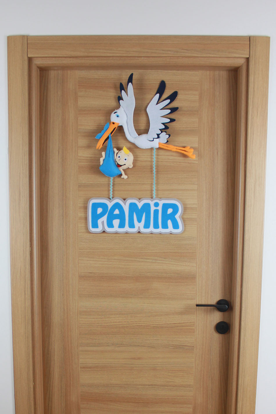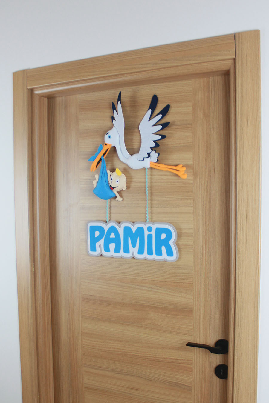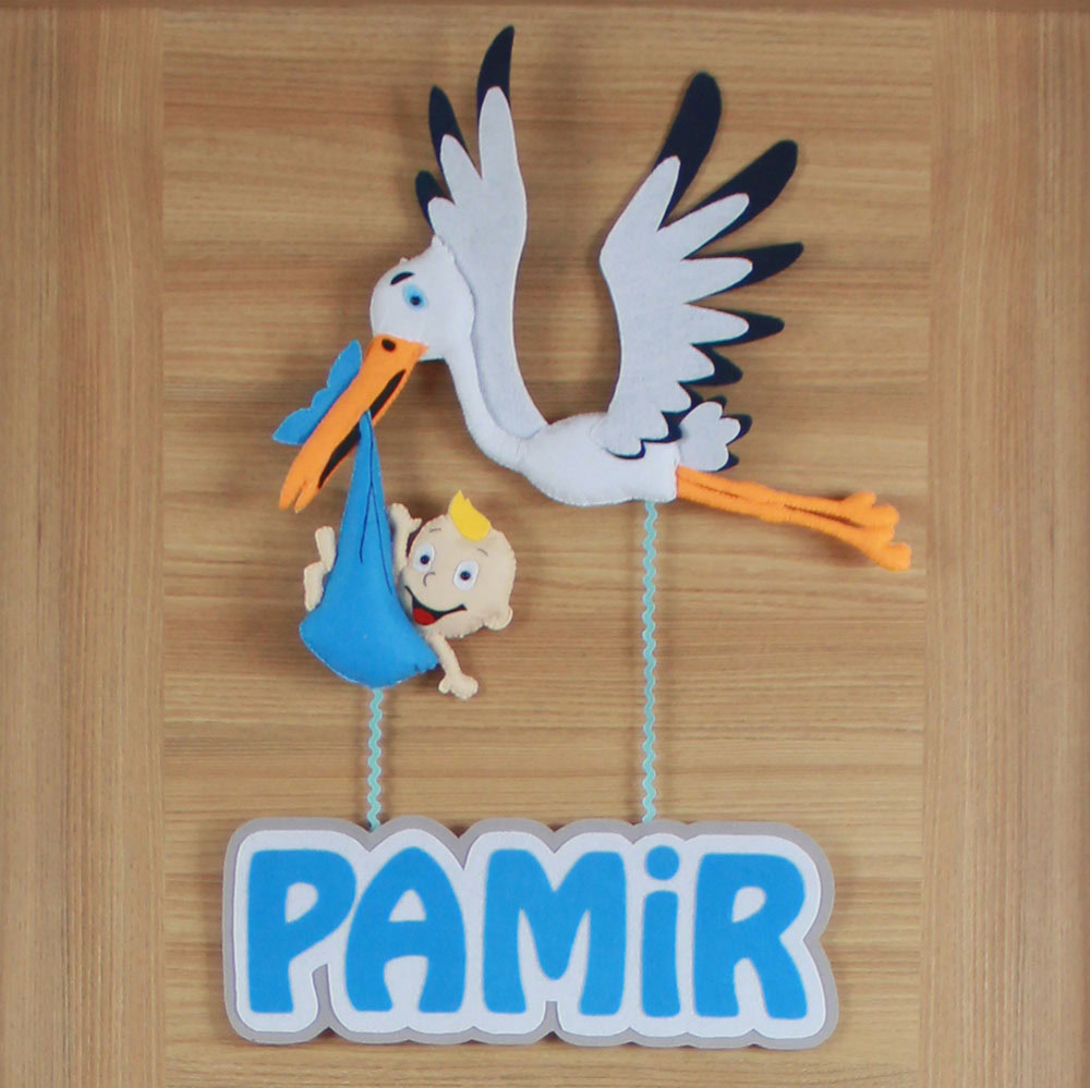 Bebeğinizin gelişini müjdeleyen, geleneksel ve sevimli bir karşılama! Tamamen el yapımı bu özel keçe kapı süsü, beyaz ve lacivert detaylı kanatlarıyla uçan bir leylek figüründen oluşur. Leylek, gagasında mavi bir kundakta sevimli bir bebek taşımaktadır. Leyleğin altından sarkan iplerle, beyaz-mavi kontürlü büyük harflerle “PAMİR” ismi yer almaktadır. Hastane odası, bebek odası ve çocuk odası dekorasyonu için mükemmeldir. Klasik bebek temasını modern bir tasarımla buluşturan, kişiye özel ve unutulmaz bir hediye seçeneğidir.