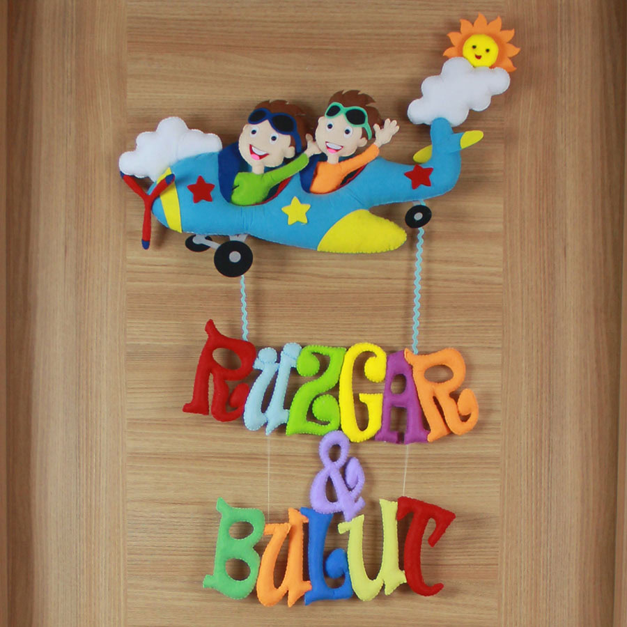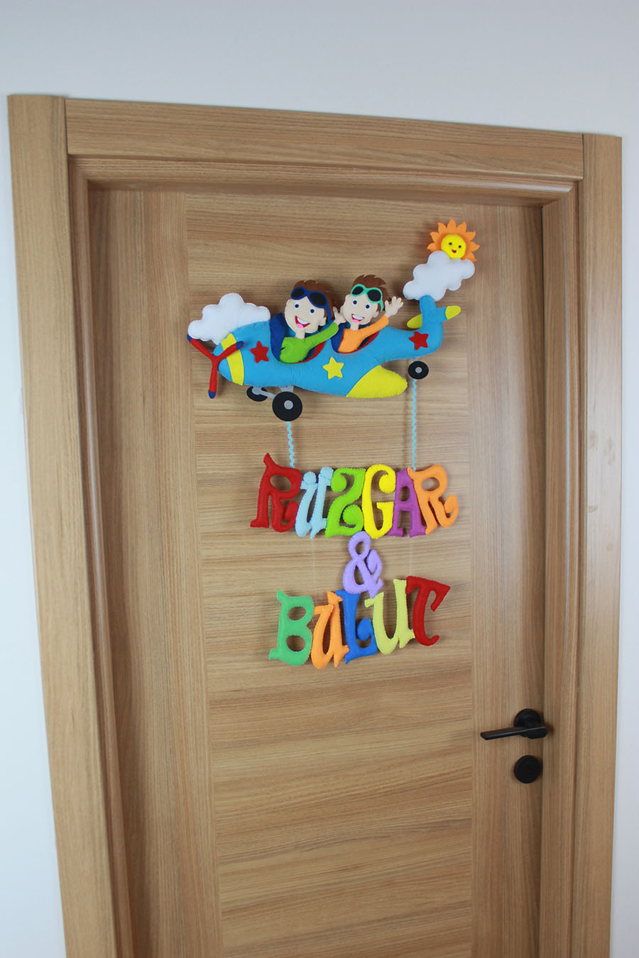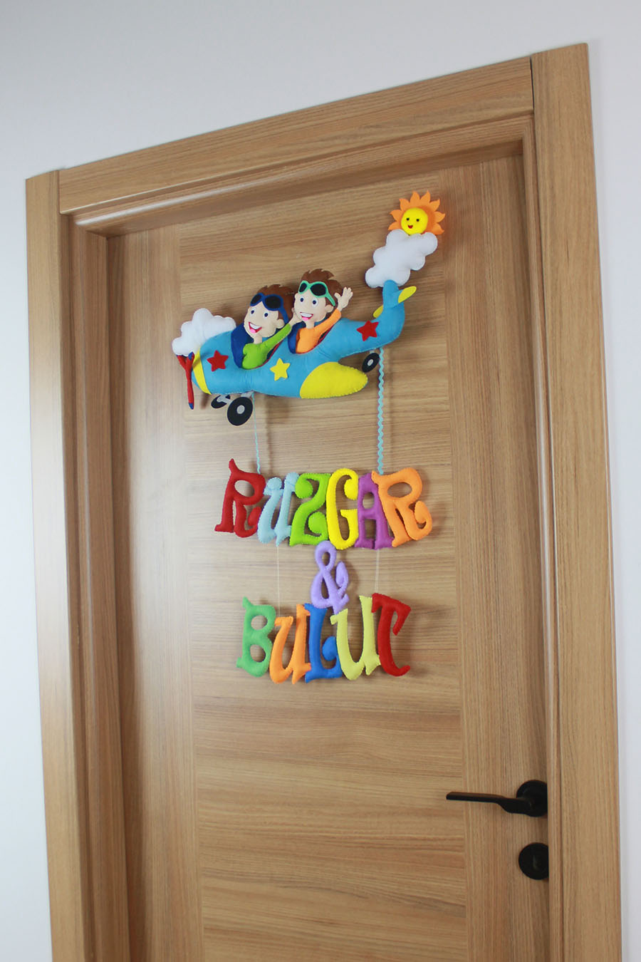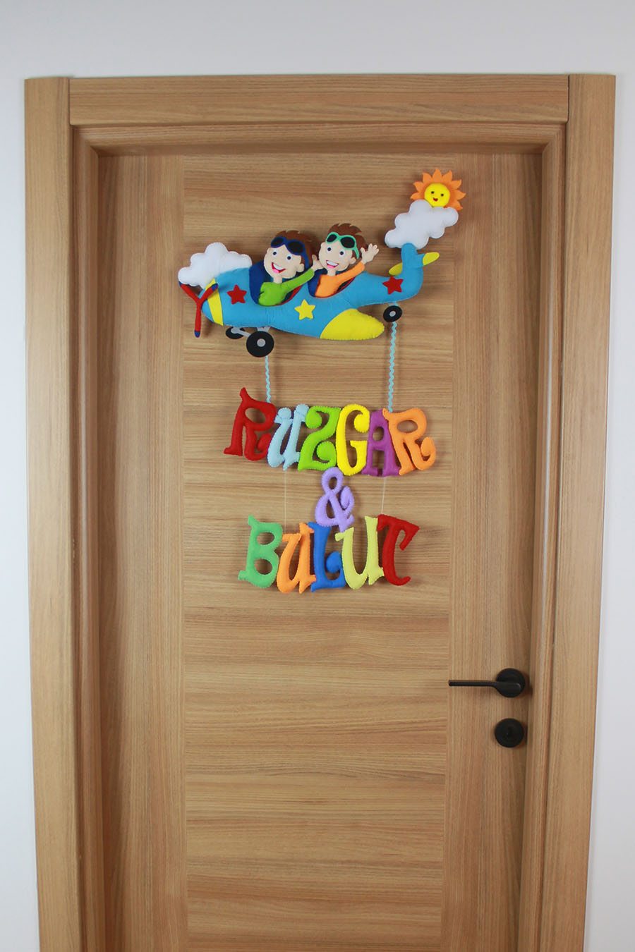 İki kardeş için hazırlanan bu eşsiz el yapımı keçe kapı süsü, maceraperest ruhları yansıtıyor! Uçakla gökyüzünde süzülen sevimli pilot kardeşler Rüzgar ve Bulut’un isimleri, canlı renkli keçe harflerle aşağıya sarkıyor. Hastane odası, bebek odası veya çocuk odası için mükemmel bir karşılama dekorasyonu sağlar. Yüksek kaliteli keçe malzemeden üretilmiş olup, canlı renkleri ve özgün tasarımıyla odanın atmosferine neşe katar. İkiz veya kardeşler için kişiselleştirilmiş hediye arayanların ilk tercihi.