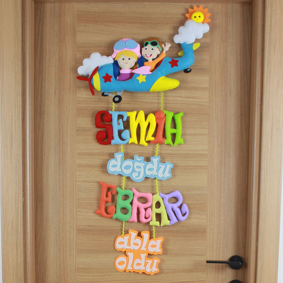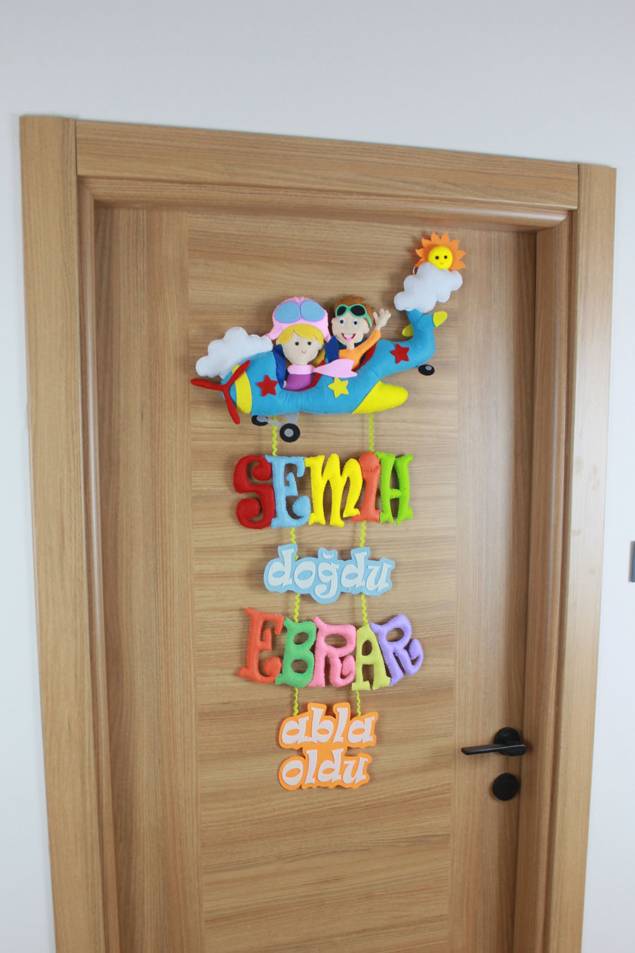 Semih ve ablası Ebrar’ın macera dolu kardeşliğini kutlayın! Tamamen el yapımı keçe süs, iki sevimli pilot figürünün kullandığı mavi-sarı uçak, güneşli gökyüzü ve canlı renklerdeki SEMİH doğdu / EBRAR abla oldu mesajını bir araya getiriyor. Bu çift isimli ve mesajlı tasarım, kardeş odaları, hastane kapısı ve doğum kutlamaları için mükemmeldir. Havacılık, gökyüzü ve macera temalı dekorasyon arayanlar için kalıcı ve kişiselleştirilmiş çok özel bir hediye seçeneğidir.