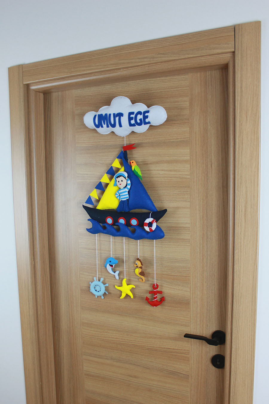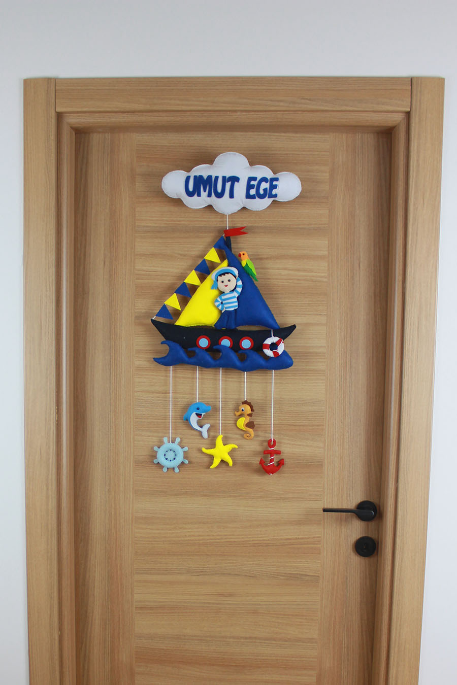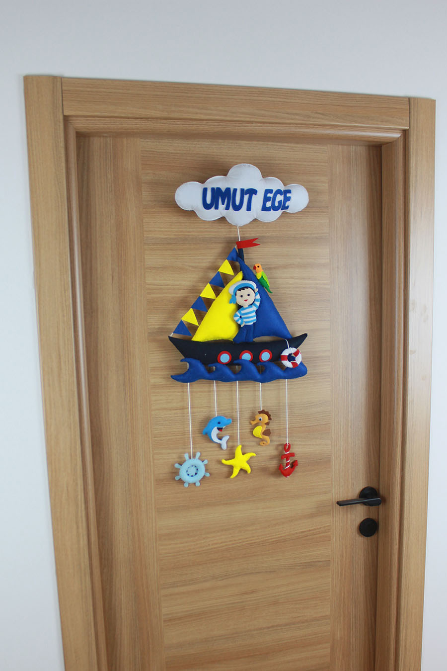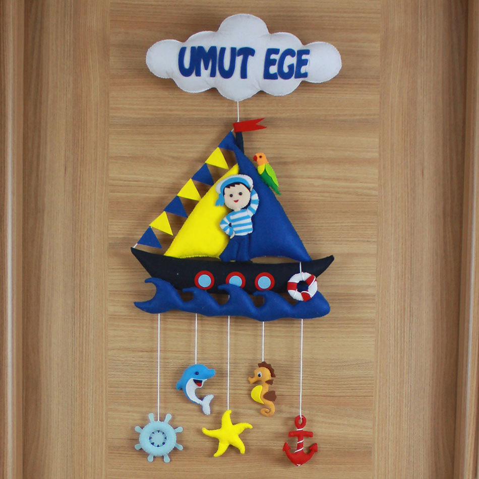 Küçük kaptanınız için denizlerin ferahlığını odasına taşıyın! “UMUT EGE” ismine özel tasarlanan bu el yapımı keçe kapı süsü, detaylı bir yelkenli gemi, sevimli denizci figürü ve sarkan deniz canlıları (yunus, deniz atı, deniz yıldızı, çapa ve dümen) ile bezelidir. Mavi, sarı ve kırmızı renklerin canlılığıyla hazırlanan bu set, hastane odası ve bebek odası dekorasyonu için mükemmel bir temadır. Tamamen el emeği olan dolgulu figürler, bebeğinizin odasına derinlik ve neşe katar.