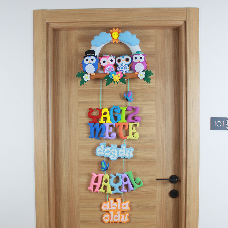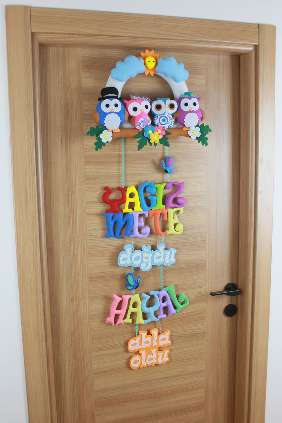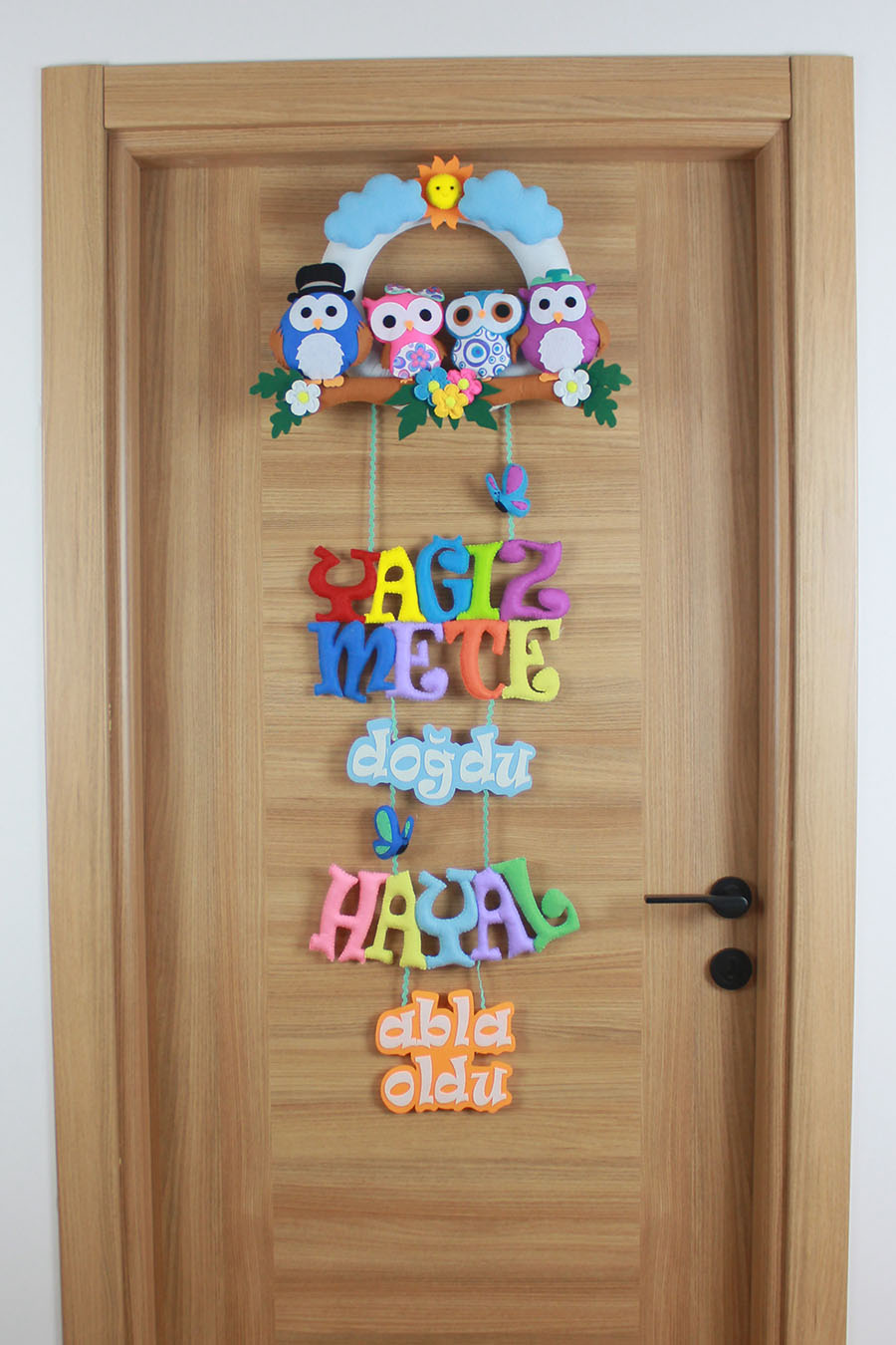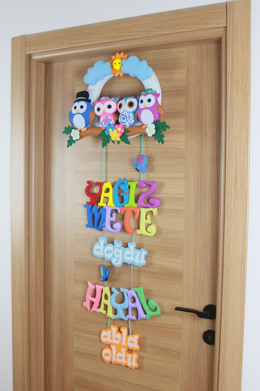 Kardeş sevincini kapınızda kutlayın! “Yağız Mete Doğdu, Hayal Abla Oldu” mesajıyla hazırlanan bu özel el yapımı keçe kapı süsü, dörtlü baykuş ailesi figürüyle kalabalık ve mutlu aileleri temsil ediyor. Rengarenk dolgulu harfler, sevimli çiçekler ve kelebek detaylarıyla bezenmiş bu tasarım, hem hastane odası hem de çocuk odası için mükemmel bir hatıradır. Ablayı da sürece dahil eden bu duygusal tasarım, en özel günlerinizde size eşlik edecek.