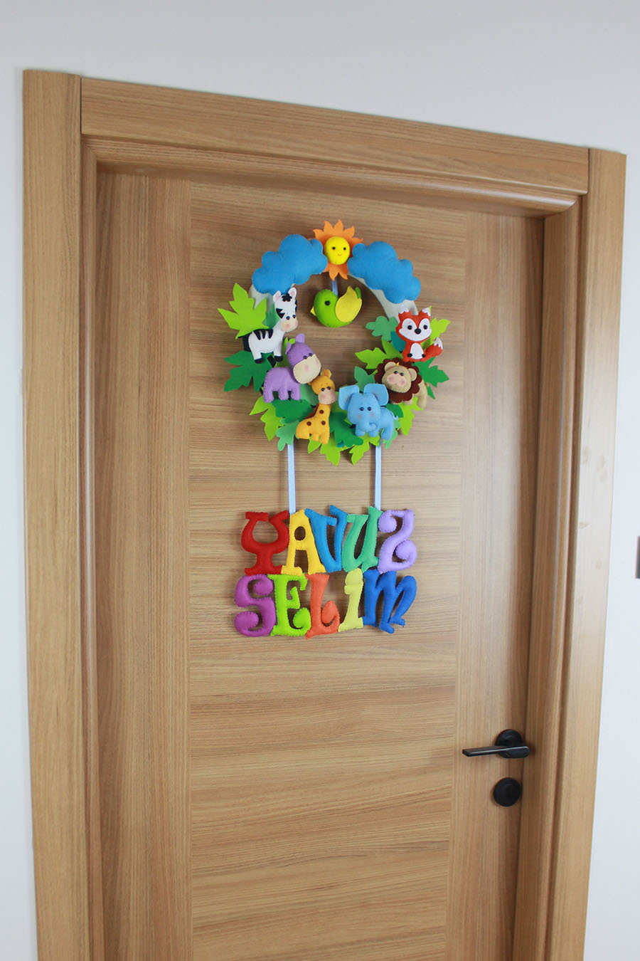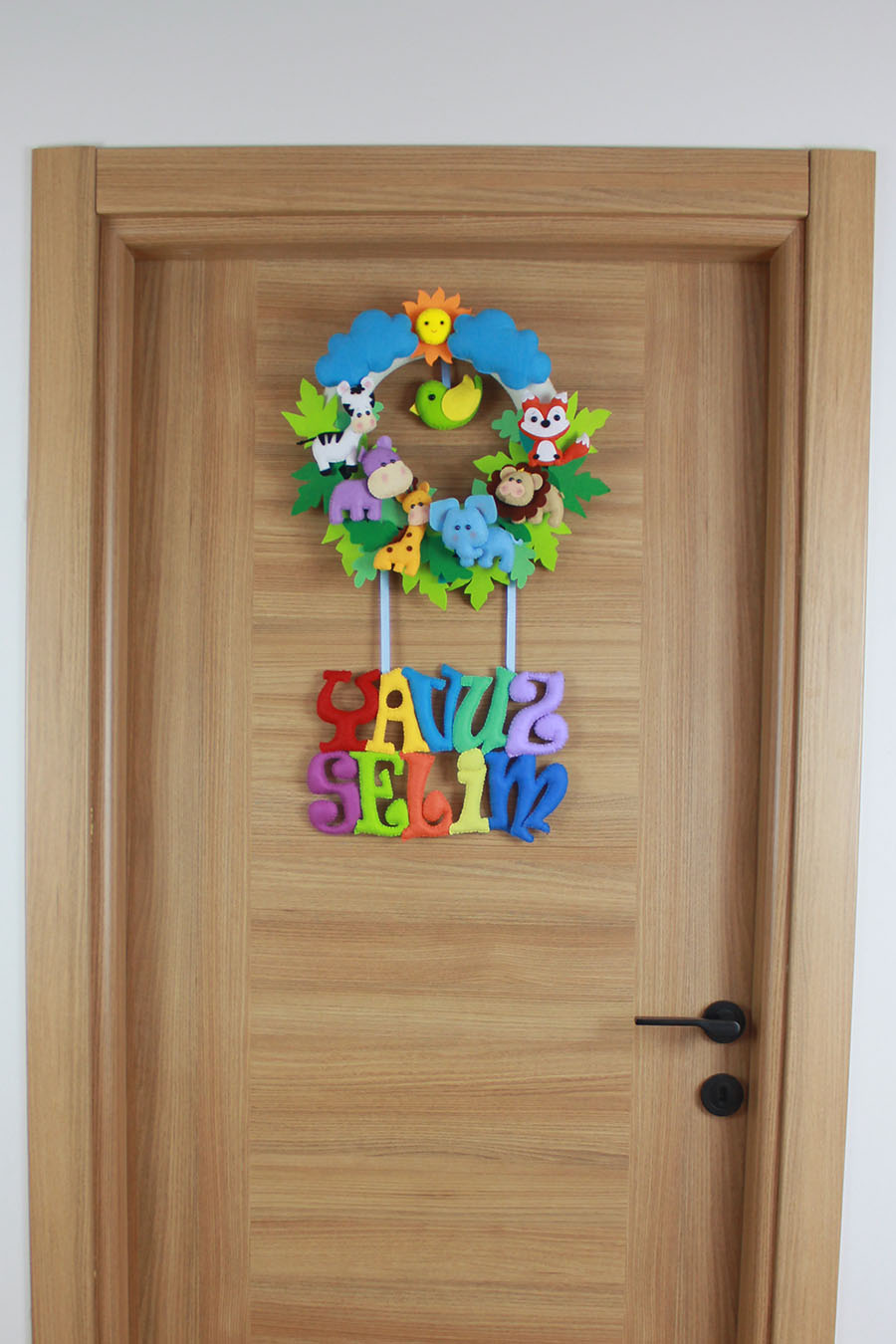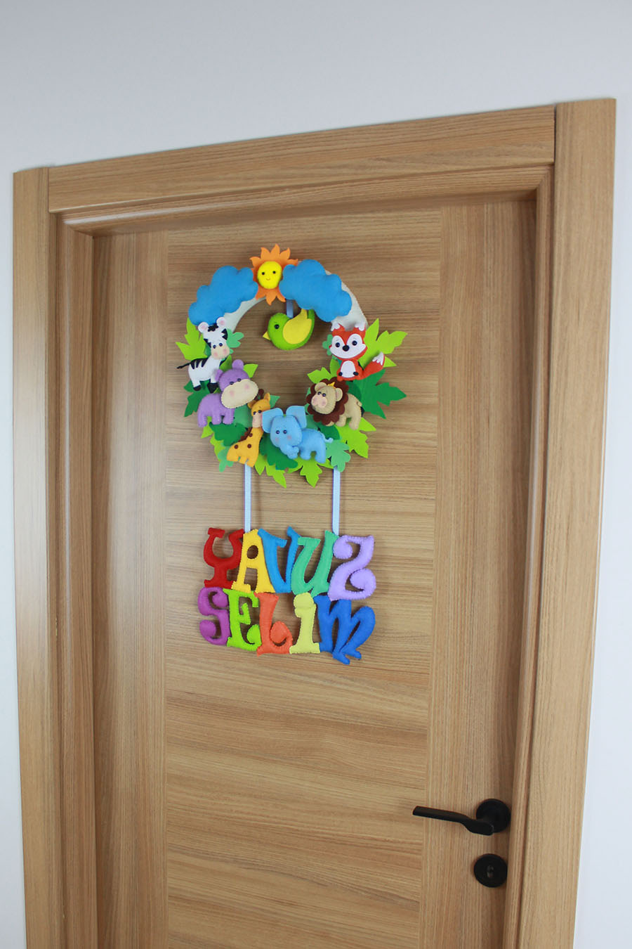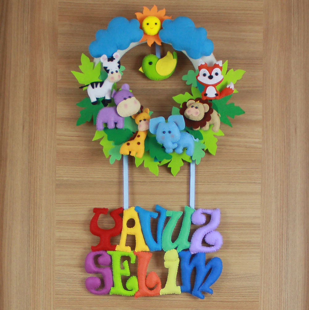 Bebeğinizin odasına doğanın enerjisini taşıyın! “YAVUZ SELİM” ismine özel hazırlanan bu zengin tasarımlı el yapımı keçe kapı süsü; aslan, fil, zürafa, zebra, su aygırı, tilki ve sevimli bir kuş figürüyle bezendi. Bol yapraklı orman teması, güneş ve bulut detaylarıyla birleşerek muazzam bir derinlik sunar. Hastane odası ve bebek odası dekorasyonunda fark yaratacak bu ürün, tamamen el emeği ve dolgulu keçe figürlerden oluşmaktadır.