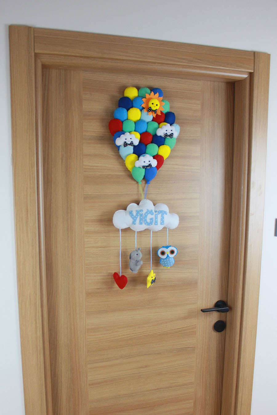 Yiğit bebeğin odasına gökkuşağı renklerini taşıyın! Bu özel tasarım kapı süsü, en üstte sarı, mavi, kırmızı ve yeşil tonlarda büyük bir balon demeti; içerisinde gülen güneş ve bulut figürleri barındırır. Orta kısımda “YİĞİT” yazılı yumuşak bir bulut ve alt kısımdan sarkan sevimli fil, baykuş, yıldız ve kalp figürleriyle bebeğinizin hayal dünyasını süsler. Tamamen el yapımı keçe malzemeden üretilen bu dolgulu model, hem hastane çıkışı hem de bebek odası dekoru için mükemmel bir hediyedir.