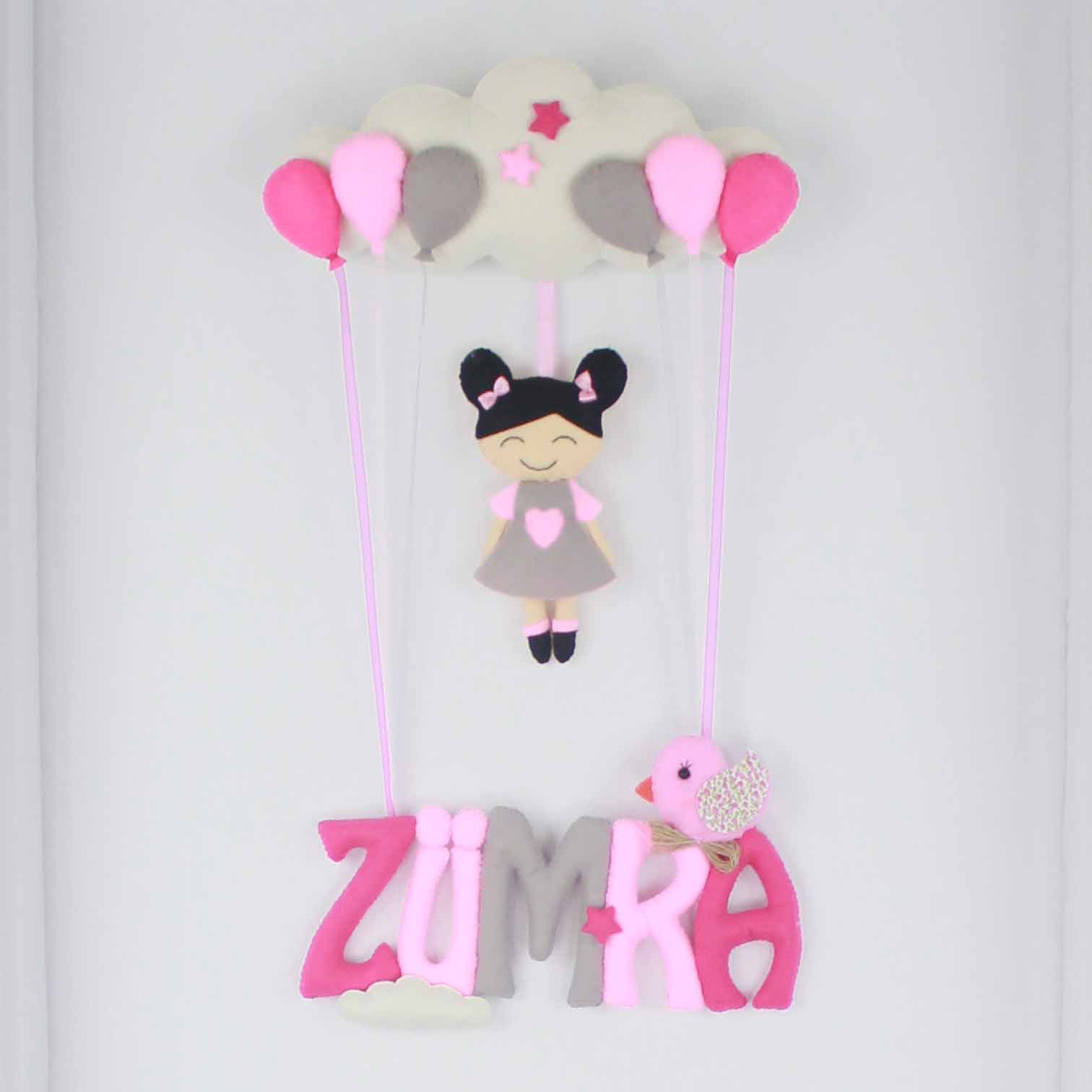 Kapı süsünün orta bölümünde, pembe kalp detaylı gri elbisesiyle şirin bir kız bebek figürü bulunmaktadır. Bu sevimli bebek, alt kısımda pembe ve gri tonlarında yazılmış “ZÜMRA” ismine doğru salınmaktadır. İsmin üzerinde konumlanmış minik bir gri kuş figürü ve altındaki bulut detayı, tasarıma masalsı bir dokunuş katar. Pembe kurdeleler tüm öğeleri birbirine bağlayarak zarif bir bütünlük sağlar. Bu kişiye özel kapı süsü, hem bebeğinizin odasının atmosferini zenginleştirir hem de sevdiklerinize unutulmaz bir hoş geldin mesajı verir.